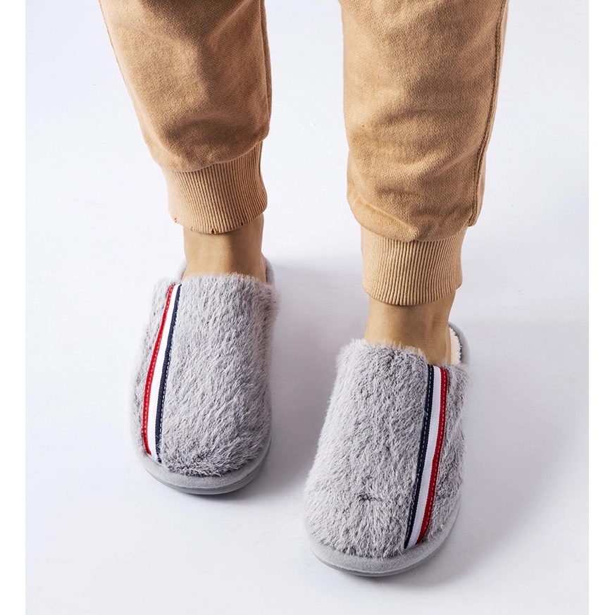Des pantoufles pour femmes confortables et insérées dans une couleur gris universelle. Fabriqué en tissu doux, isolé, avec une semelle en caoutchouc et un talon bas de 1,5 cm - parfait pour les jours plus frais à partir de la collection d'automne. Pratique, confortable et discrète - idéal à porter à la maison tous les jours.