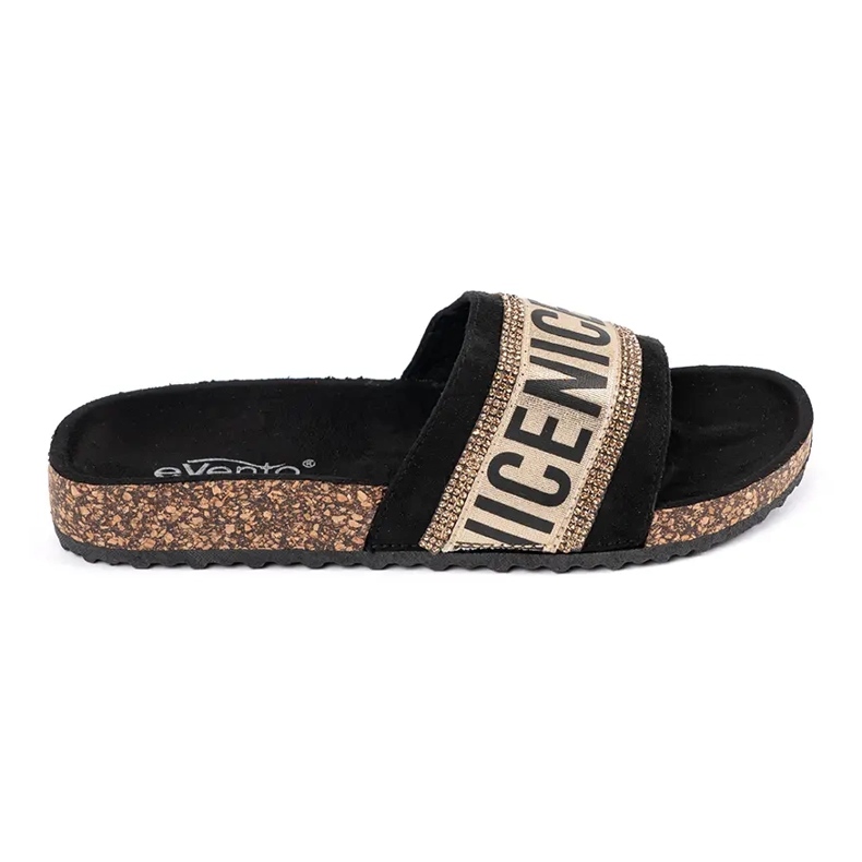 Les tongs Evento Evento Events Events Elegant et confortables sont une proposition pour les fans occasionnels, le style à la mode. La finition noire du daim écologique et des cristaux brillants (strass) leur donne une lueur subtile, grâce à laquelle ils travailleront quotidiennement et lors des réunions d'été avec des amis.