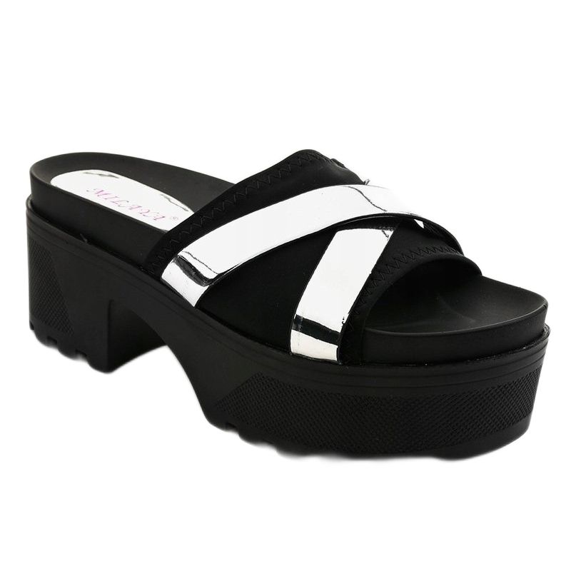 Découvrez l'élégance et le confort qu'offrent les mules à talons hauts noires CL-3A309-43 de la marque Inna. Ces tongs élégantes pour femmes sont dotées d'une tige en cuir écologique, non seulement esthétique, mais également respectueuse de l'environnement. La large bande noire au-dessus des orteils est ornée de fines rayures argentées spectaculaires qui se croisent au milieu, conférant aux chaussures un charme extraordinaire.