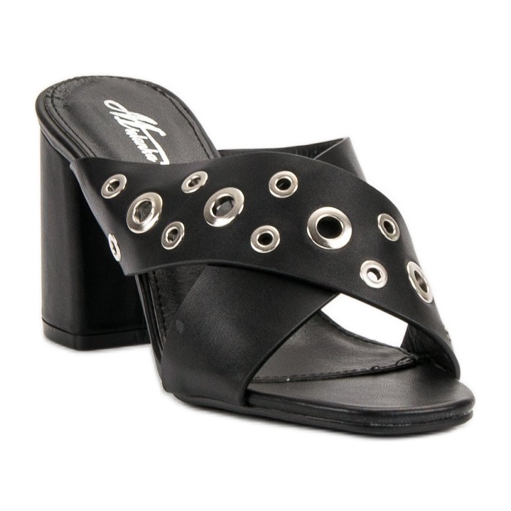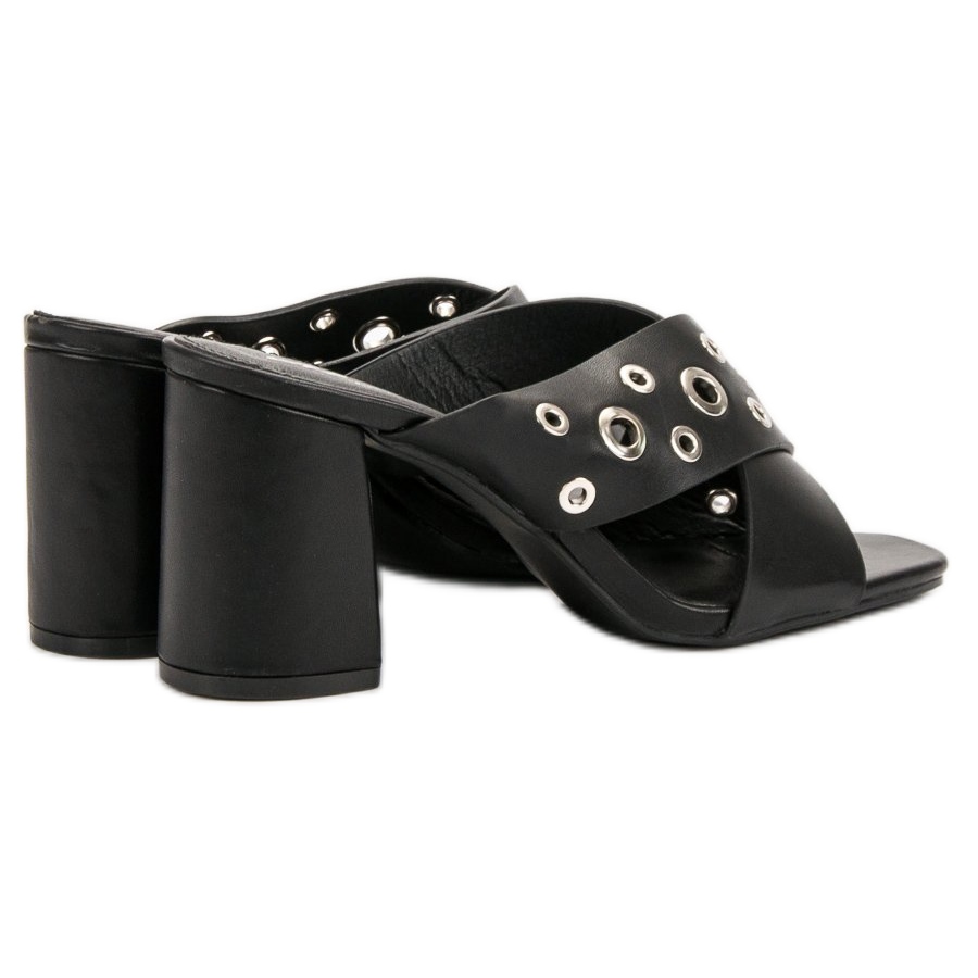 Découvrez des mules noires à talons hauts uniques qui correspondent parfaitement aux tendances rock de la mode ! Ces chaussures élégantes ont été créées pour les femmes qui souhaitent se démarquer. Leur design moderne et leurs strass argentés attirent l'attention et ajoutent du caractère à n'importe quel style.