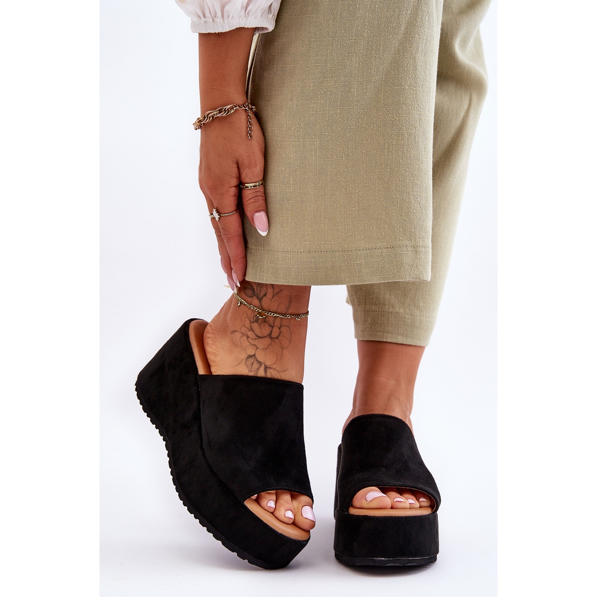 La semelle intérieure souple en éco-cuir assure le confort du pied, même pendant de longues heures d'utilisation. La hauteur du coin est de 8,5 cm et la plateforme de 4 cm, ce qui permet un port confortable sans alourdir les articulations. Ces proportions assurent un équilibre optimal et permettent un allongement subtil de la silhouette sans effort inutile.