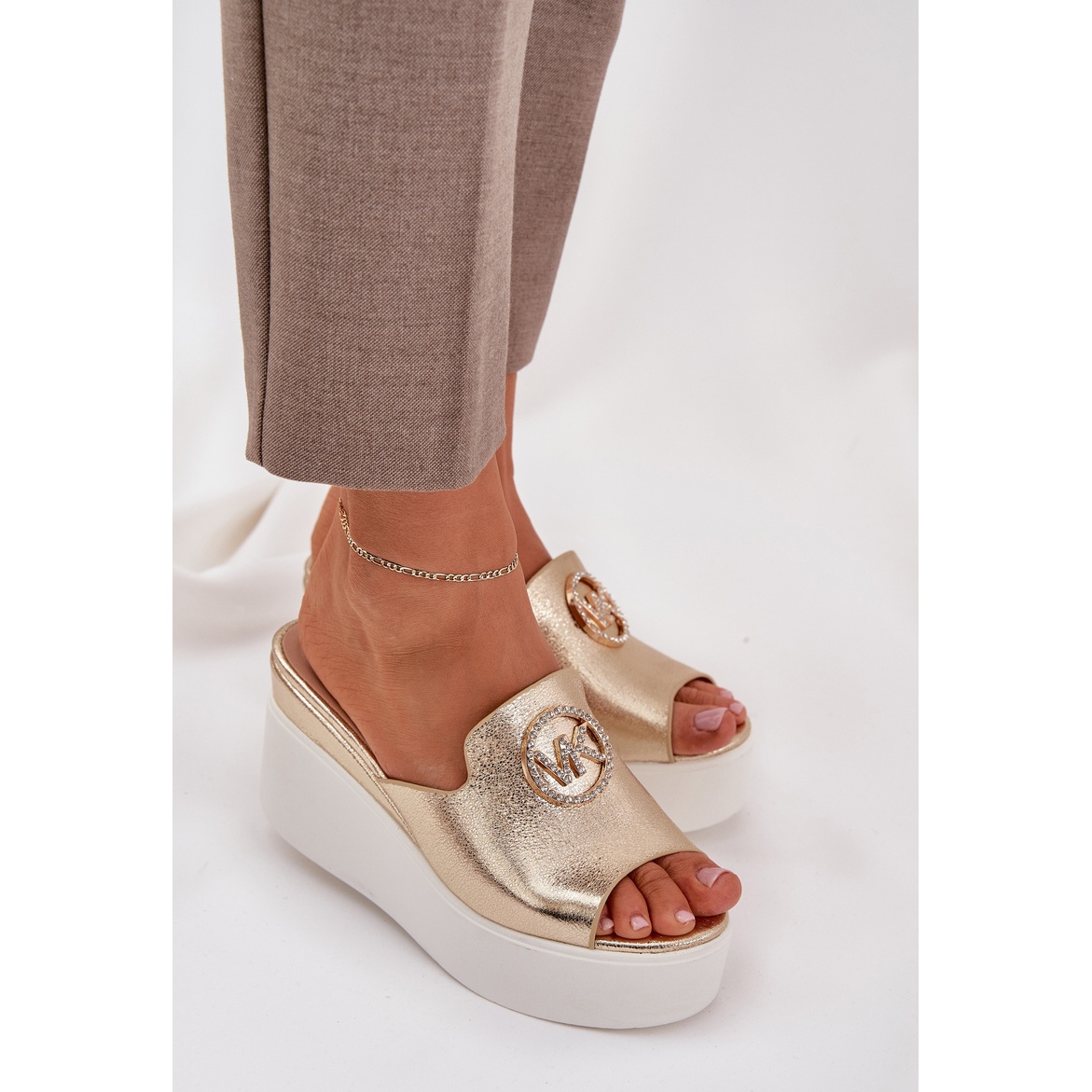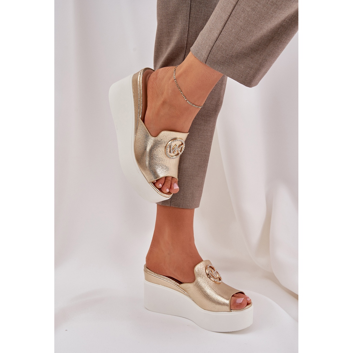 Inna marka Pantoufles sur la plate-forme et coins avec un ornement doré d'or