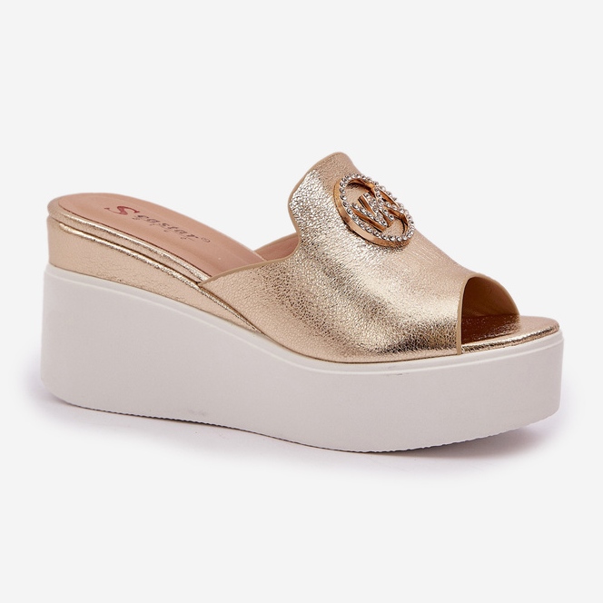 Détails: Pantoufles sur la plate-forme et coins avec un ornement doré d'or