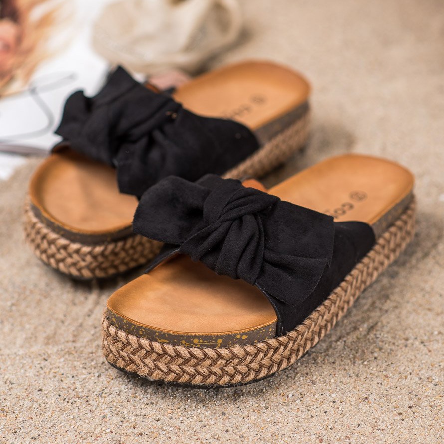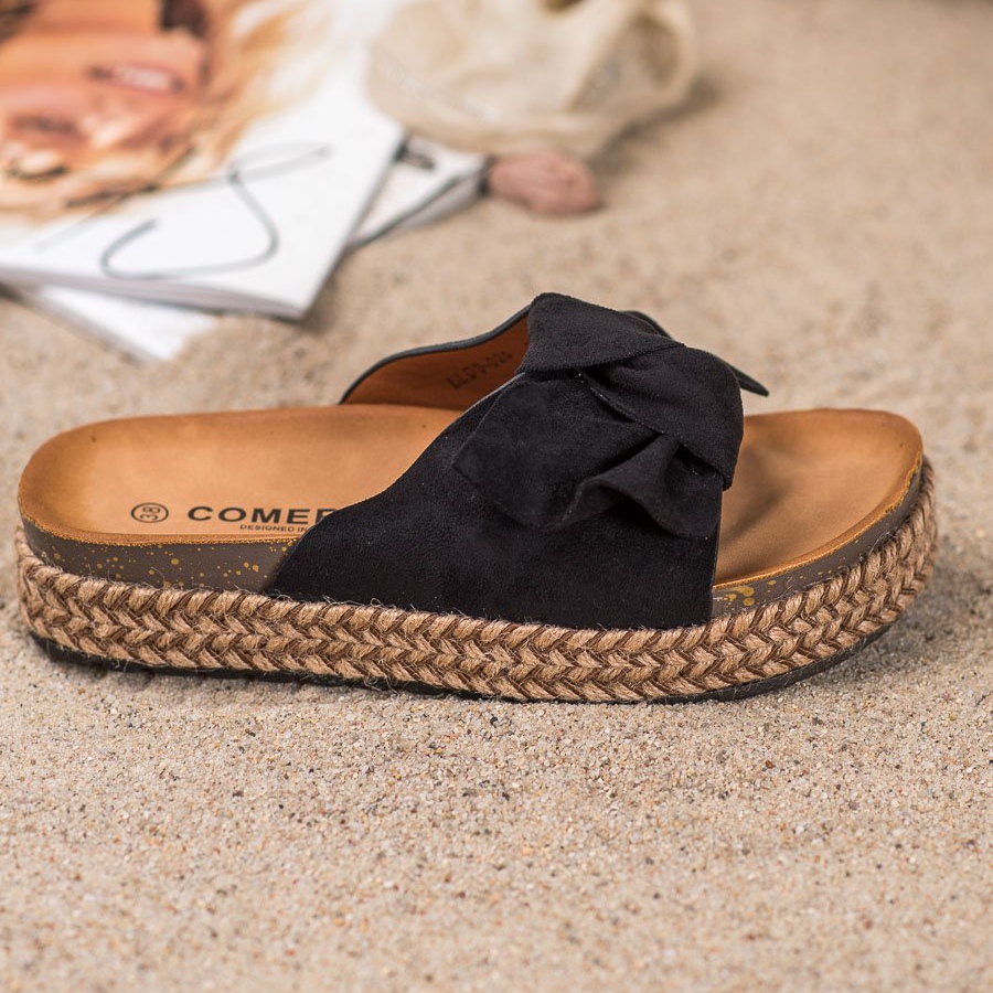 Les tongs à plateforme haute de la marque Comer sont le choix parfait pour toute femme à la mode qui valorise à la fois le style et le confort. Fabriquées en cuir suédé écologique de haute qualité, ces tongs noires se distinguent par leur design impressionnant, accrocheur avec une semelle décorée et un charmant nœud.