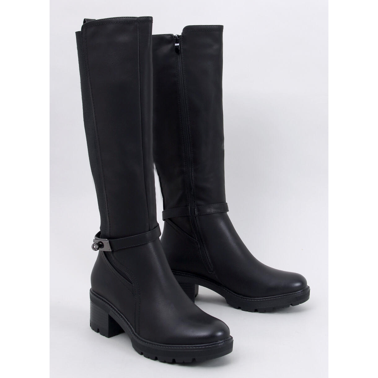 La partie flexible de la tige, composée d'une combinaison de cuir écologique et de caoutchouc, permet aux bottes de s'adapter parfaitement à la forme de la jambe, en soulignant sa ligne et en assurant un port confortable. Grâce à cette innovation, ce modèle est idéal pour diverses silhouettes et coupes de mollets.