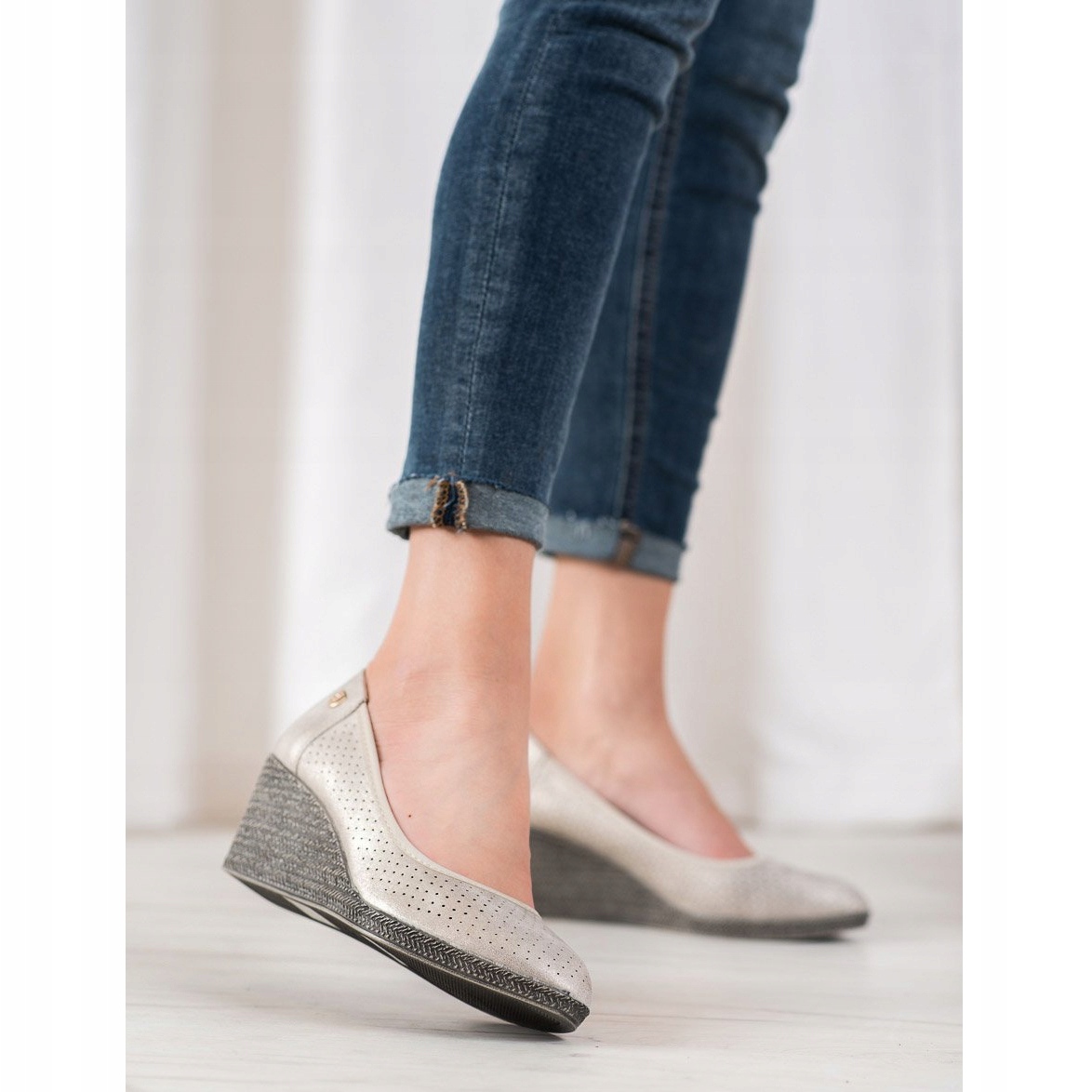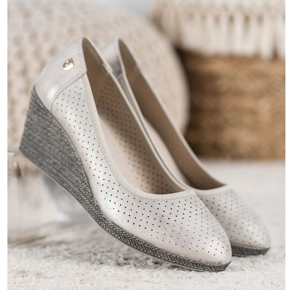 Les escarpins compensés beige clair sont la quintessence du style féminin et du confort. Fabriqués en cuir écologique de haute qualité, ils se caractérisent par un motif élégant et ajouré qui leur confère légèreté et un caractère unique.