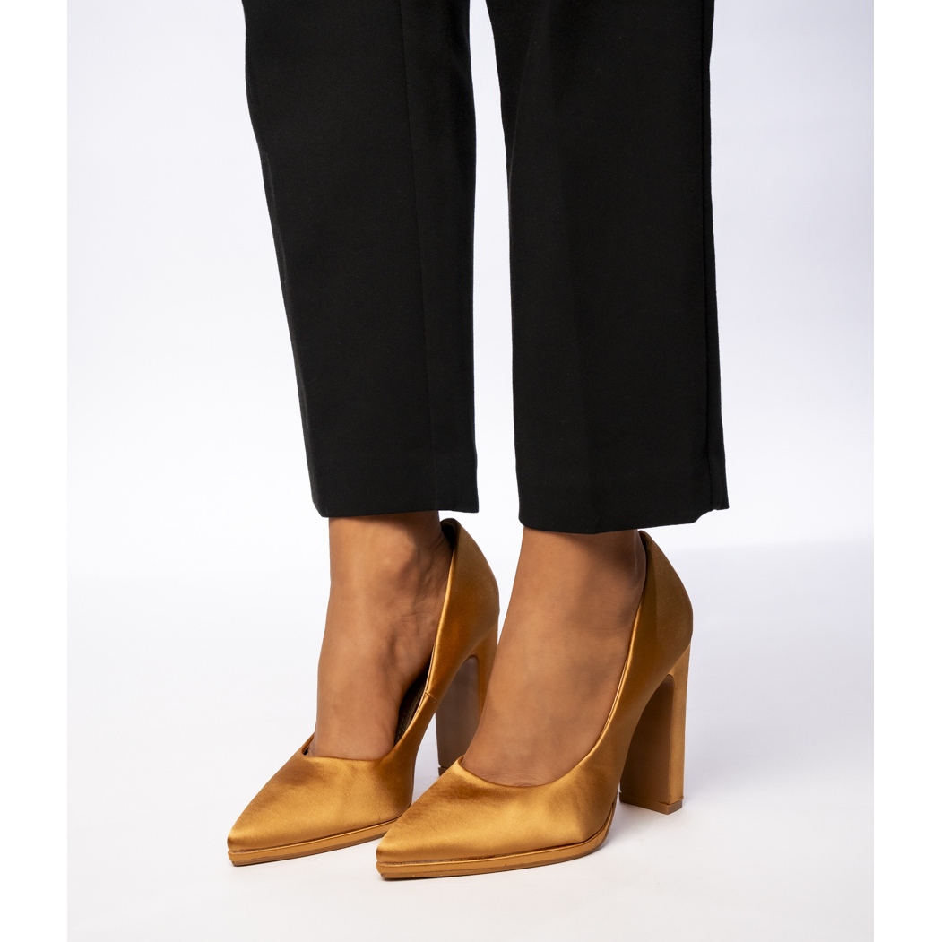 La teinte de chameau chaude et la finition subtile en satin donnent à ces pompes un caractère unique qui attire l'œil et complète chaque création élégante. Le poteau élevé a non seulement mince la silhouette, mais garantit également le confort de porter toute la journée, ce qui en fait le choix parfait pendant de longues heures de travail ou lors des fêtes.