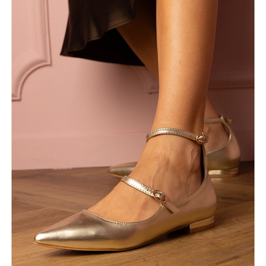 Détails: Pompes dorées avec des talons plats avec des boucles d'or