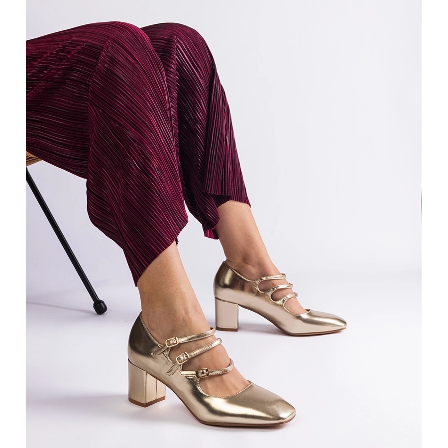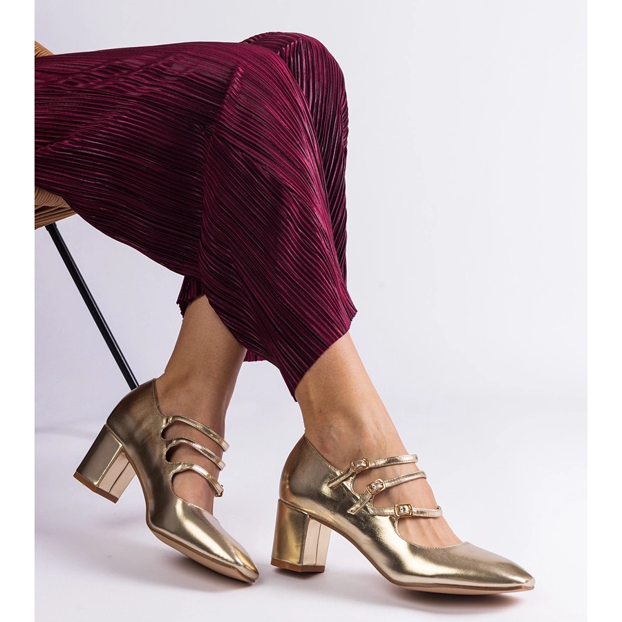 Les pompes dorées sur un poteau avec des boucles décoratives sont une proposition idéale pour les femmes qui veulent combiner la mode et le confort. Ces chaussures élégantes se distinguent non seulement par une belle couleur dorée, mais aussi avec un design moderne, grâce à un NOSC carré et à une finition métallique. Le cuir biologique de haute qualité rend les pompes non seulement durables, mais aussi agréables à porter.