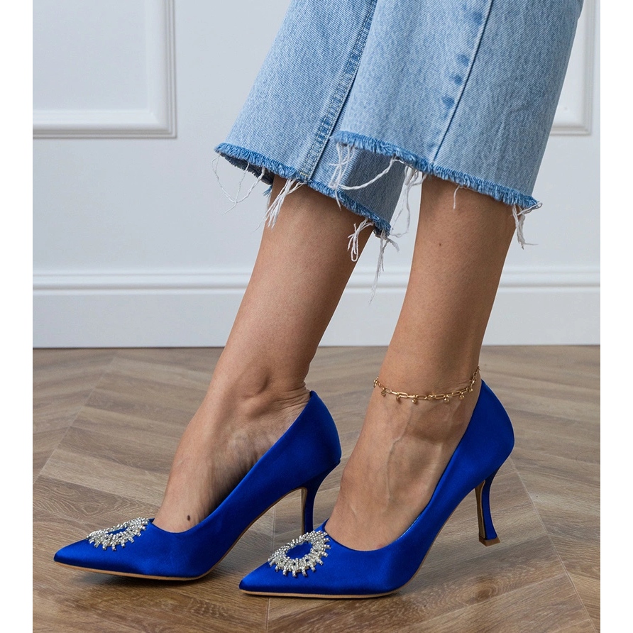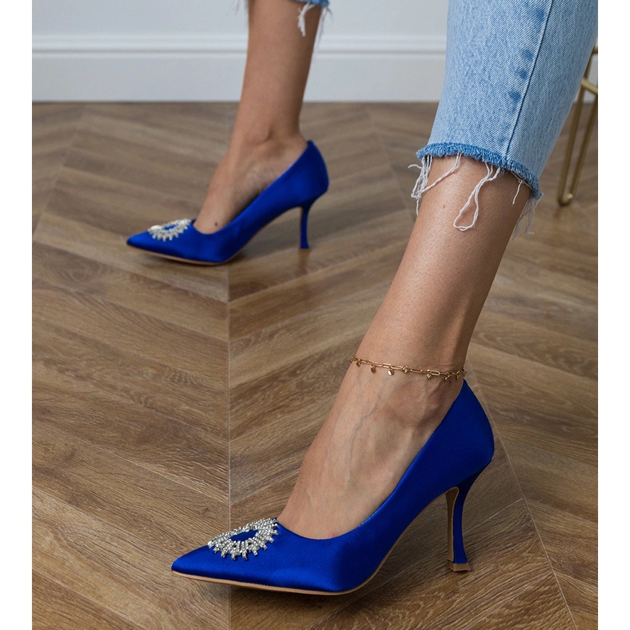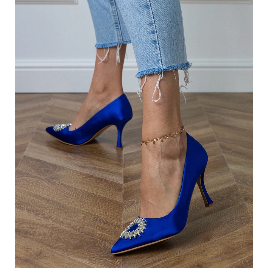Découvrez l'élégance et le style avec des pompes en satin bleu avec des zircons. Ces chaussures de femmes uniques sont un excellent choix pour toute occasion - des fêtes élégantes aux dîners romantiques. Fabriqué en tissu de haute qualité dans une belle nuance de Blu, les pompes émettent du style et de la classe.