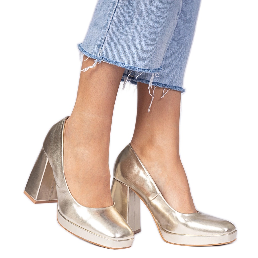 Les pompes métalliques dorées sur un modèle massif post H22-186 sont une excellente proposition pour les femmes qui veulent combiner l'élégance avec le style moderne. Grâce au talon de 10,5 cm de haut, les pompes allongent optiquement les jambes, ce qui a un effet positif sur la figure et ajoute de la confiance.
