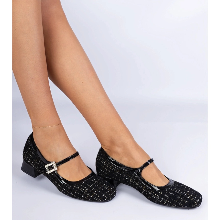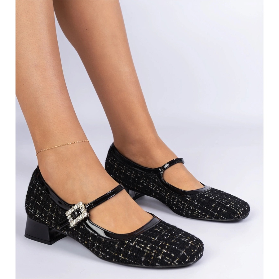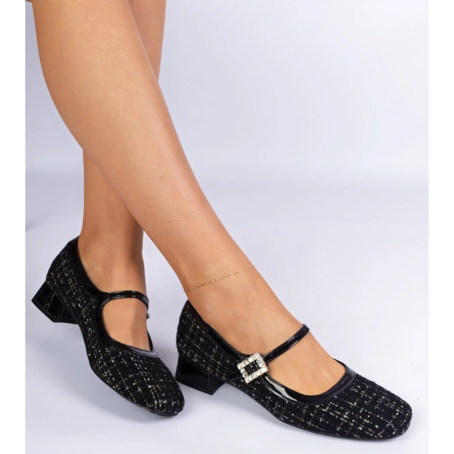 Découvrez l'élégance et le style que les pompes noires avec une finition de matériau avec des zircons offrent. Ces chaussures de femmes uniques combinent le design moderne et une forme classique, parfaitement s'adaptant à une variété de stylifications.