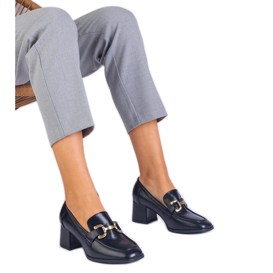 Les pompes noires se mélangent parfaitement avec diverses stylisations, et la semelle en plastique noir garantit la durabilité et la stabilité. À l'intérieur, il y a un insert en cuir écologique, ce qui augmente encore le confort.