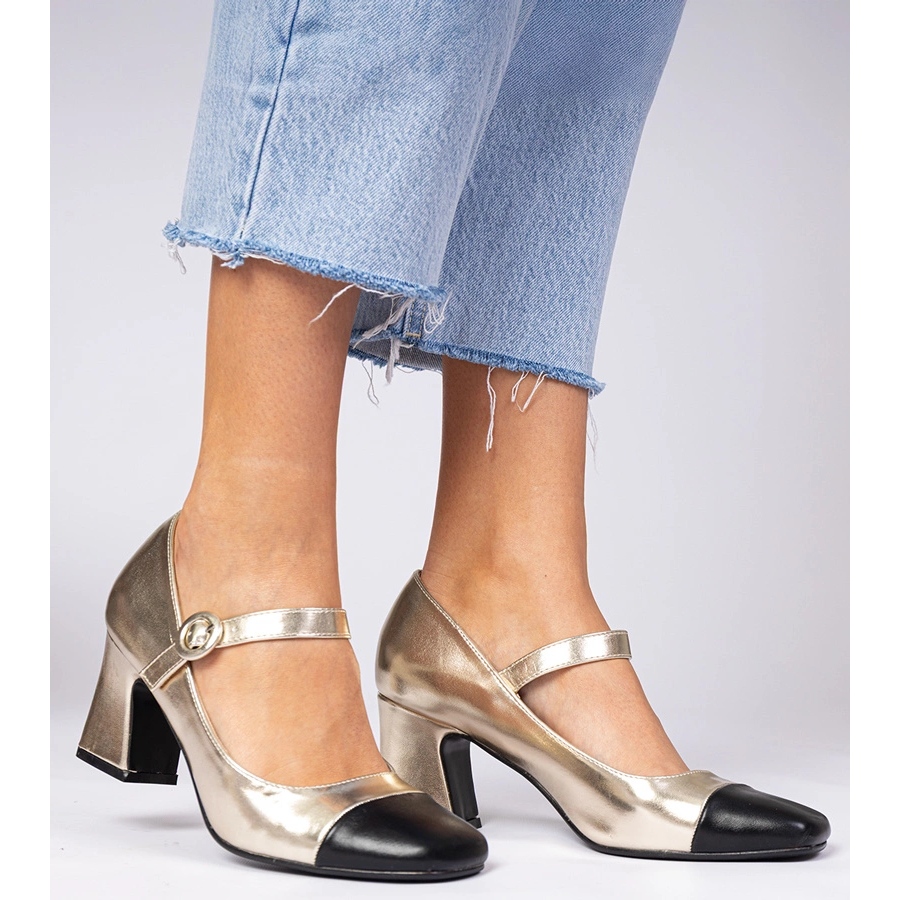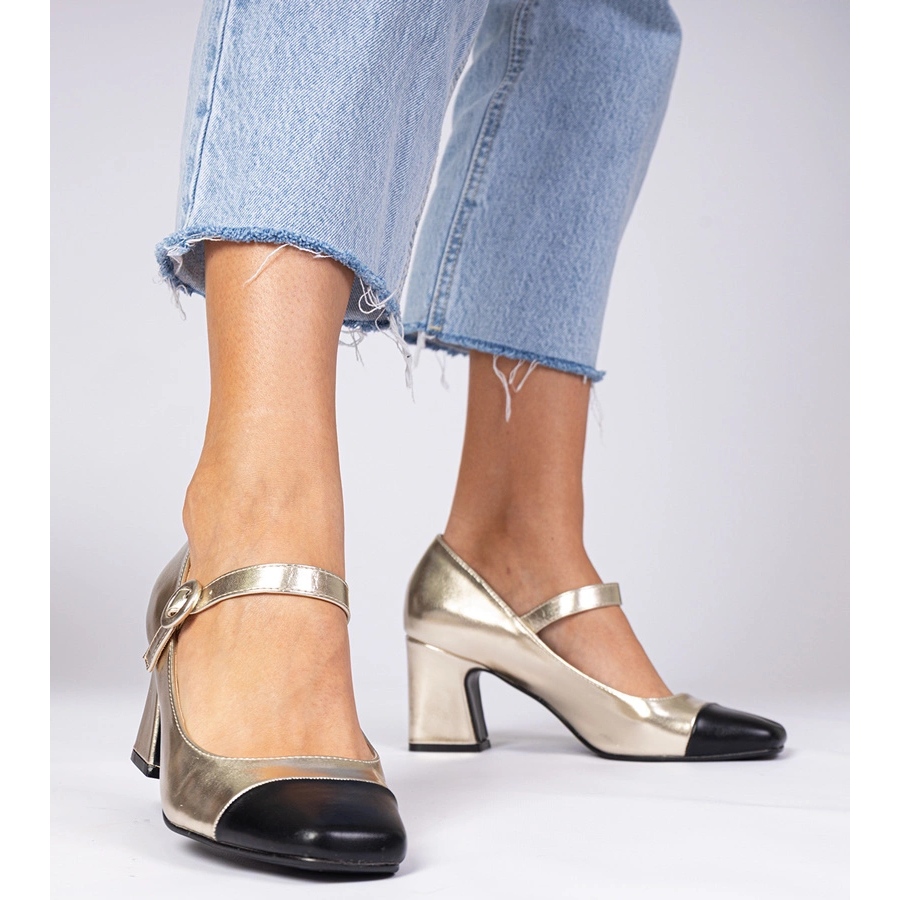 Les pompes sont en cuir écologique de haute qualité, ce qui les rend à la fois élégantes et respectueuses de l'environnement. Leur couleur dorée unique avec un nez noir contrasté attire l'œil et met l'accent sur chaque stylisation, l'ajoutant à son style et à son élégance. Un nez carré et un poteau de 7 cm de haut assurent la stabilité et en même temps allonger les jambes, ce que chaque femme appréciera certainement.