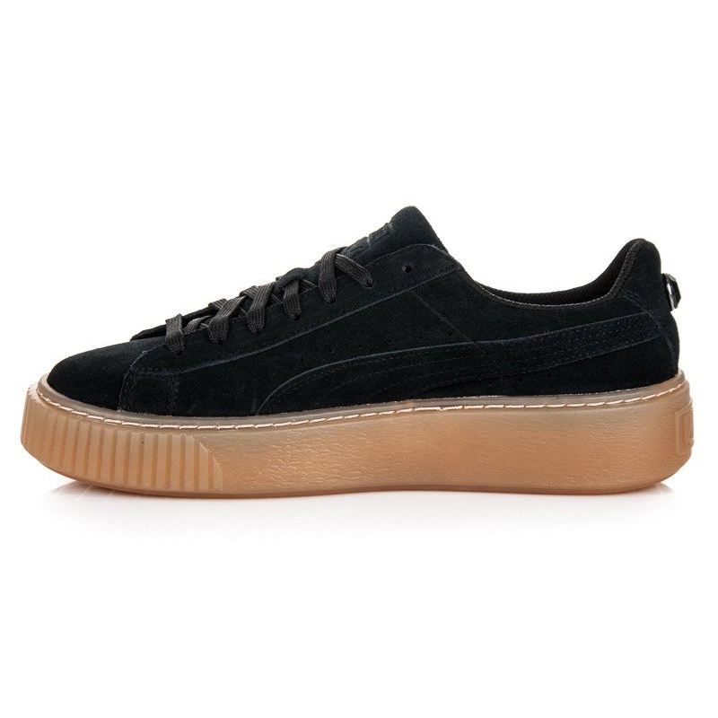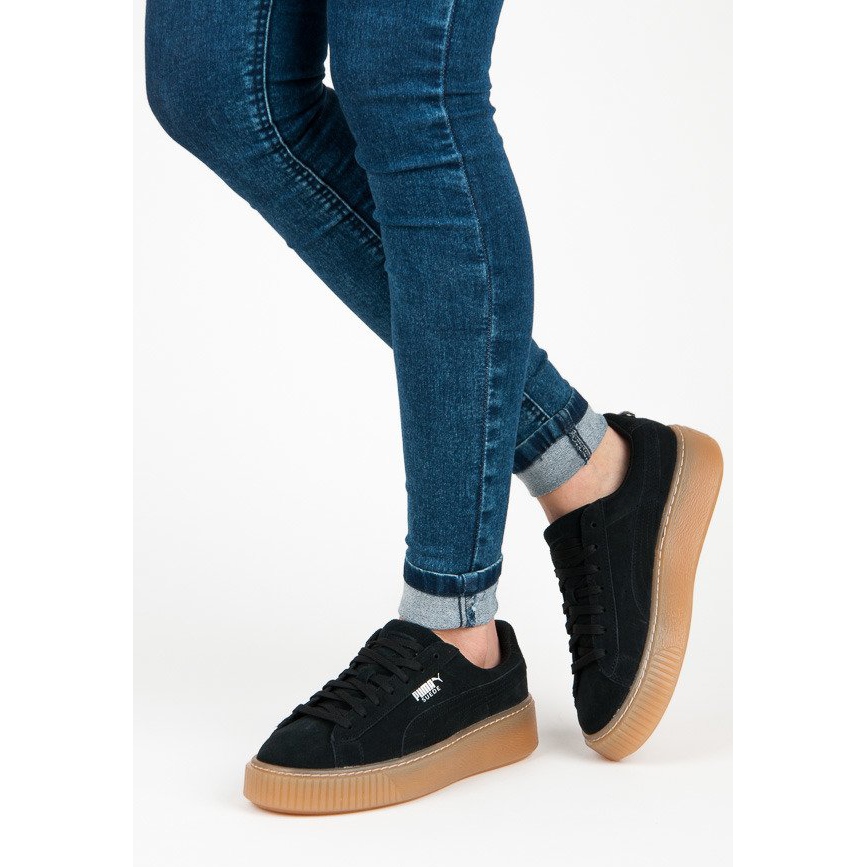 Une caractéristique des chaussures est la tige à lacets, qui permet un ajustement parfait à la forme du pied, ce qui augmente le confort d'utilisation. Le logo blanc visible de la marque Puma ajoute un caractère sportif. Les plateformes de 2,5 cm de hauteur assurent une excellente isolation du sol et stabilité, et le bout arrondi leur confère un look léger et moderne.