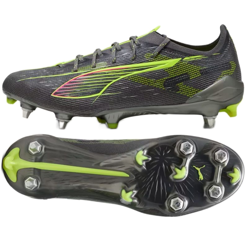 Les chaussures de football Puma Ultra 5 Ultimate MXSG 108343-03 sont un excellent choix pour chaque homme qui veut augmenter sa vitesse sur le terrain, en particulier lorsqu'il joue sur une surface douce et boueuse. Ces embouteillages professionnels de la ligne de pack le plus rapide se distinguent par un design moderne dans les couleurs gris avec un accent vert, ce qui les rend à la fois fonctionnels et élégants.