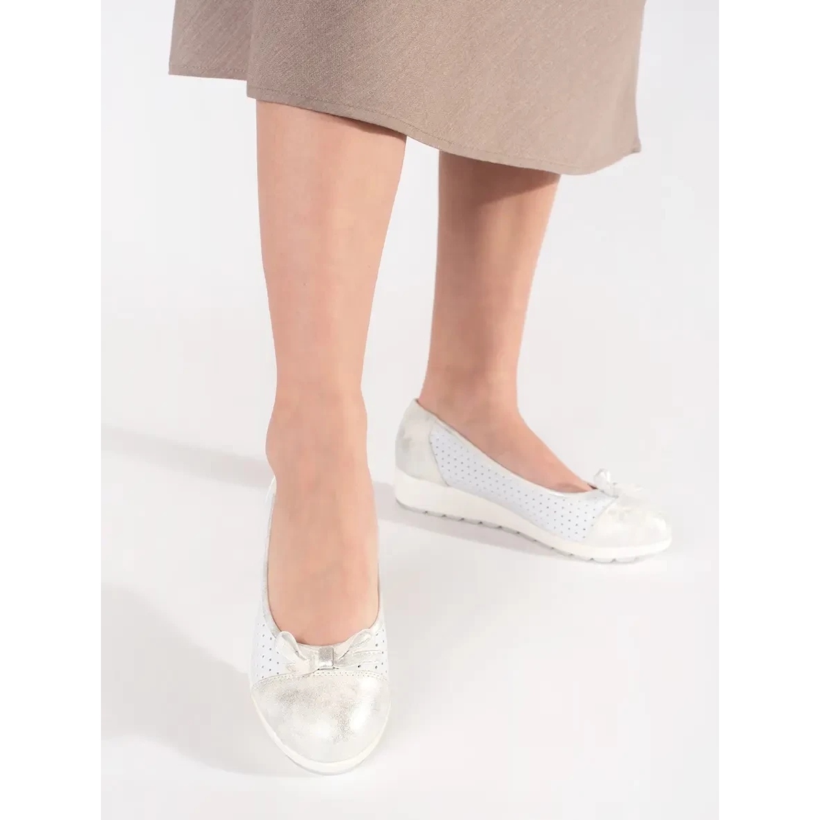 Les chaussures ont un talon construit et raidi, ce qui assure le confort lors du port et de la stabilité du pied. Ils sont faits de pelage en daim écologique, ce qui leur donne un caractère élégant, et le nez rond les fait correspondre à de nombreux styles. De plus, les accents argentés et un arc sur la tige leur donnent un charme féminin, grâce à laquelle ils sont excellents dans les combinaisons quotidiennes et plus formelles.