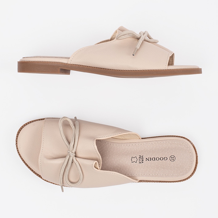 Les tongs Goodin ont un talon plat d'une hauteur de 1,0 cm, ce qui les rend extrêmement confortables, et la fixation de glissement le rend plus facile à mettre et à retirer. Le talon ouvert assure la respirabilité, ce qui est particulièrement important pendant les jours chauds. Fabriqués en cuir écologique de haute qualité, avec un insert en cuir naturel, ces tongs garantissent non seulement l'esthétique, mais aussi la durabilité.