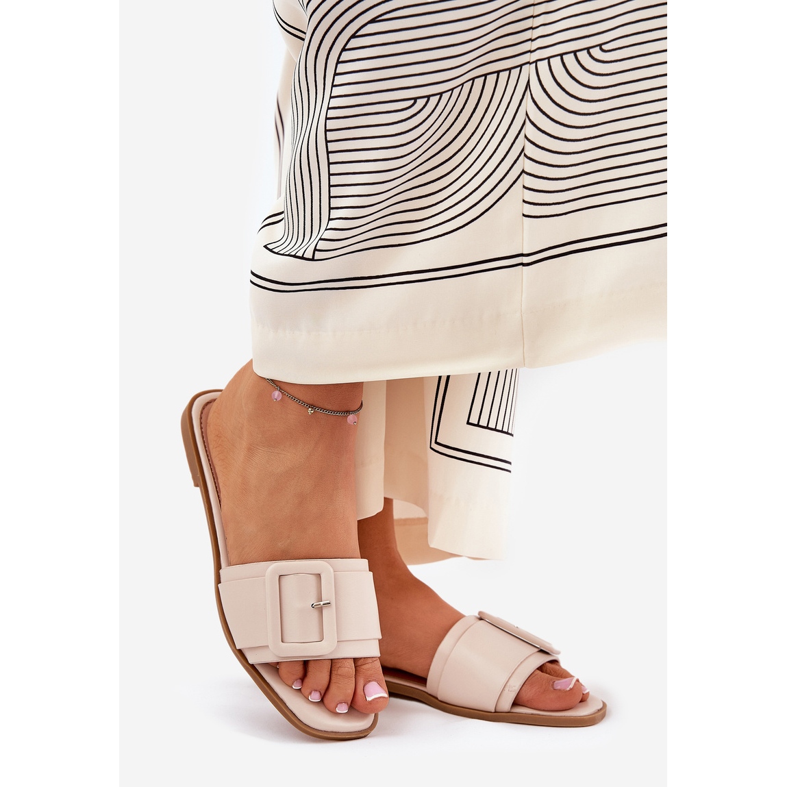Le détail caractéristique sous la forme d'une grande boucle dans la ceinture ajoute un charme subtil, faisant de ces tongs -flops un accent à la mode de tout style. Ils sont parfaits pour les deux ensembles décontractés tous les jours, ainsi que dans des tenues plus élégantes, car leur simplicité met l'accent sur la beauté naturelle de chaque femme.