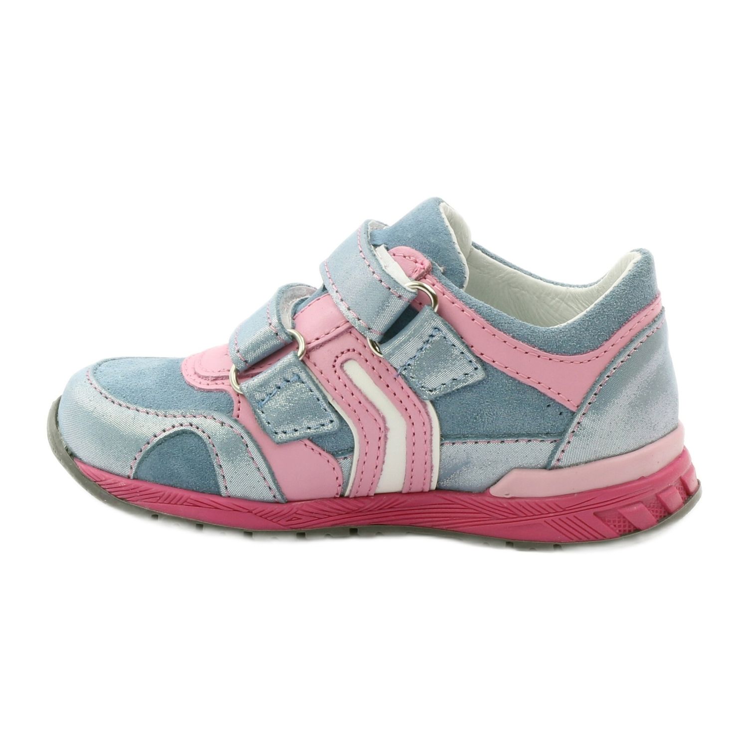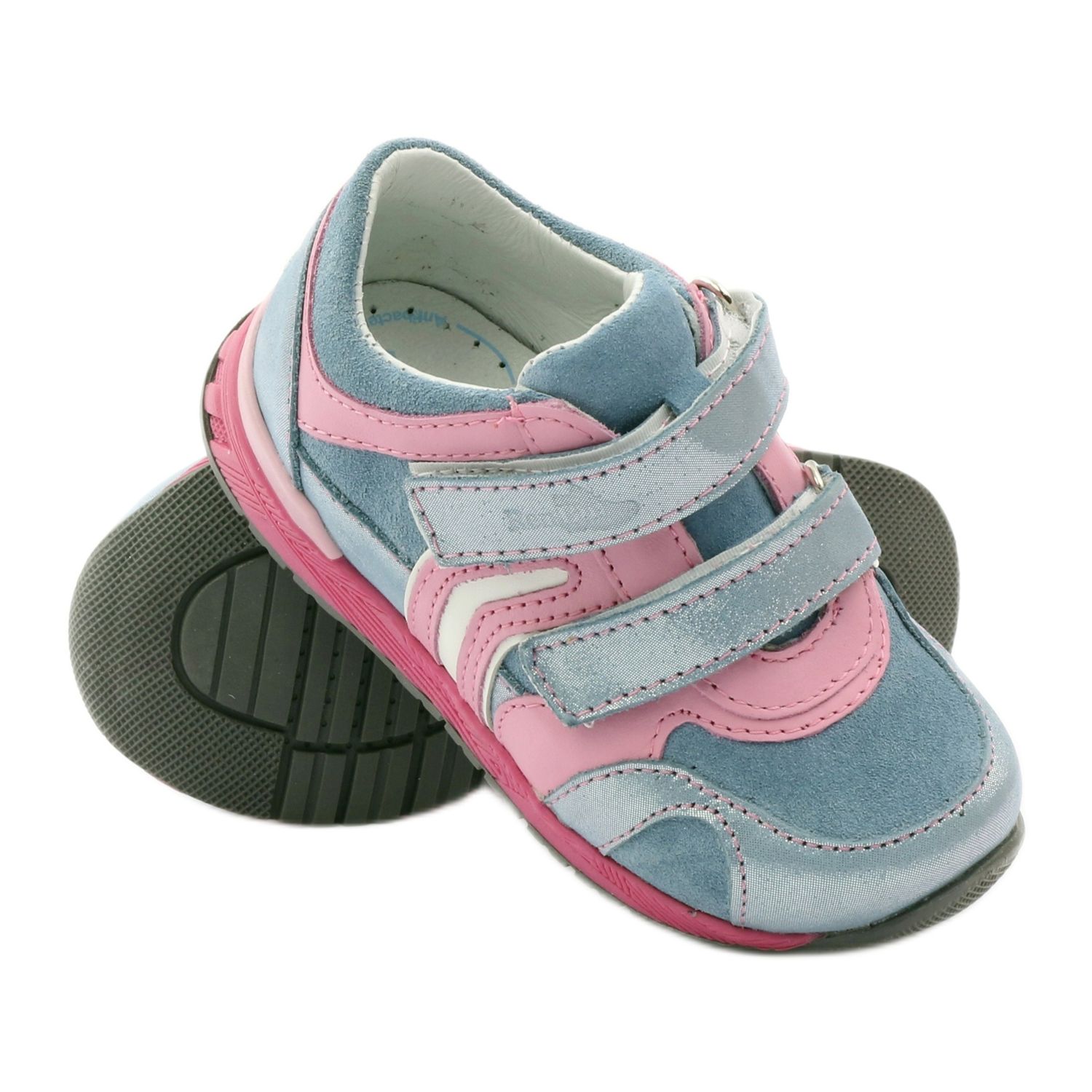 Des chaussures élégantes et confortables pour filles qui combinent des couleurs pastel délicates avec des solutions fonctionnelles. La tige est en cuir souple et naturel dans des tons de bleu, rose clair et blanc avec des accents brillants. Deux larges bandes fermeture scratch bleues facilitent l'enfilage et permettent d'ajuster précisément la chaussure au pied, et le talon rigide assure une stabilisation adéquate pendant la marche.