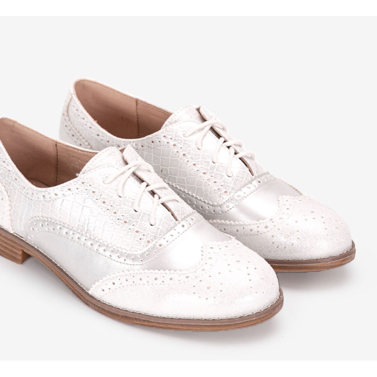 Chaussures classiques d'Oxford Hershey dans une finition argentée à la mode en cuir écologique avec une texture de peau crocodile. La coupe universelle avec un nez rond et un laçage rend le modèle parfait comme une base de stylisations quotidiennes et semi-formales. Une finition minutieuse et une attention aux détails mettent l'accent sur la haute qualité de la fabrication.