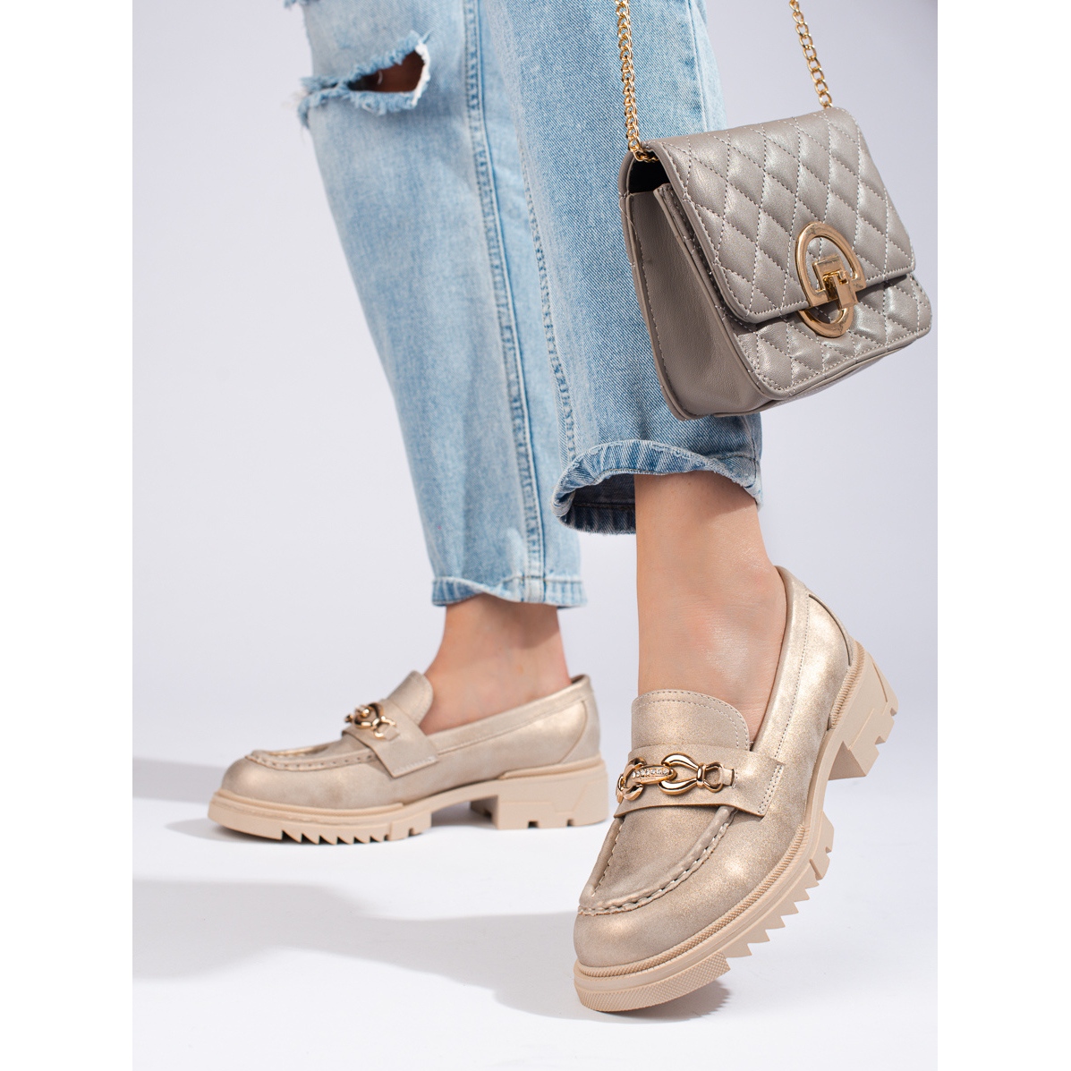 Les mocassins dorés profilés attirent l'attention et ajoutent du charme à n'importe quel style. Ils sont fabriqués à partir de cuir écologique de haute qualité, ce qui les rend respectueux de l'environnement et abordables par rapport aux alternatives en cuir naturel. Cependant, l'attention portée au confort de l'utilisateur est visible dans le cuir doux et naturel de la semelle intérieure, qui offre aux pieds une ventilation et un confort adéquats même après une utilisation à long terme.