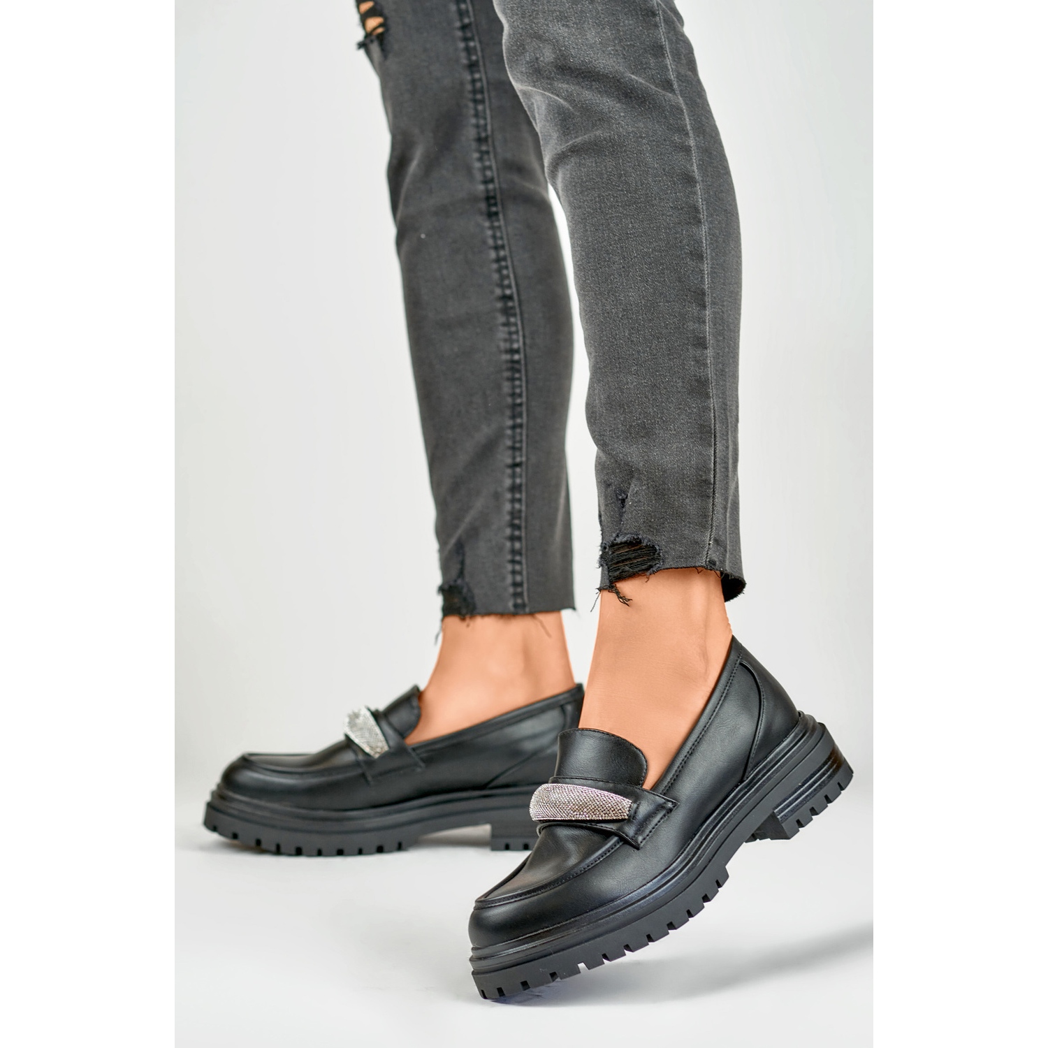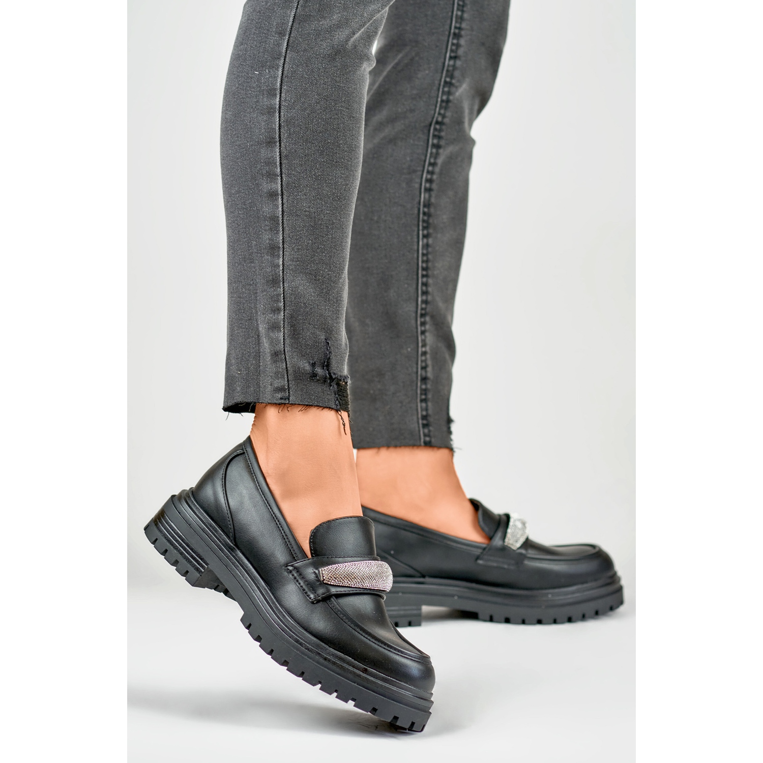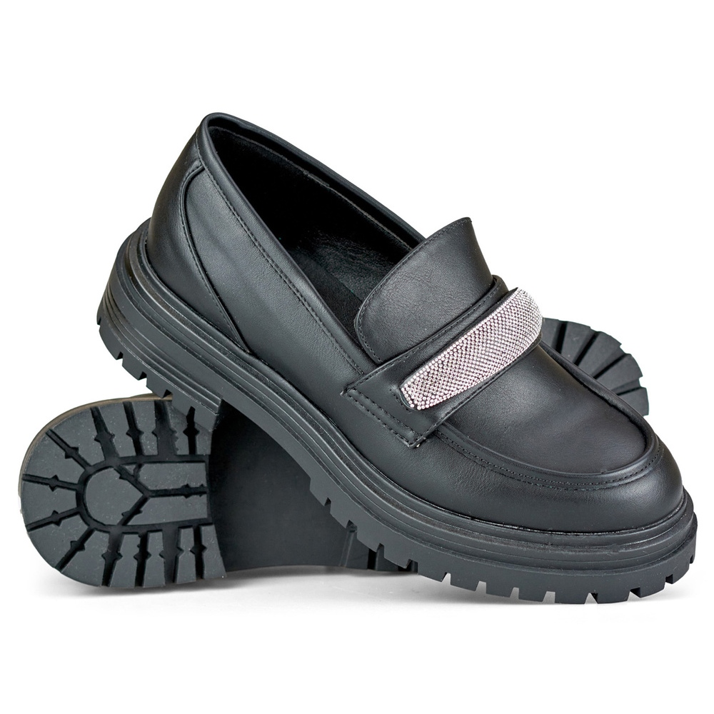 Le produit est d'élégantes chaussures noires pour femmes d'Inna. Ils sont fabriqués en cuir écologique de haute qualité, ce qui garantit durabilité et confort d'utilisation. Un avantage supplémentaire est la semelle intérieure en cuir. Un trait caractéristique de cette paire de chaussures est la décoration originale sous forme de zircons brillants, qui ajoutent brillance et élégance raffinée aux chaussures.