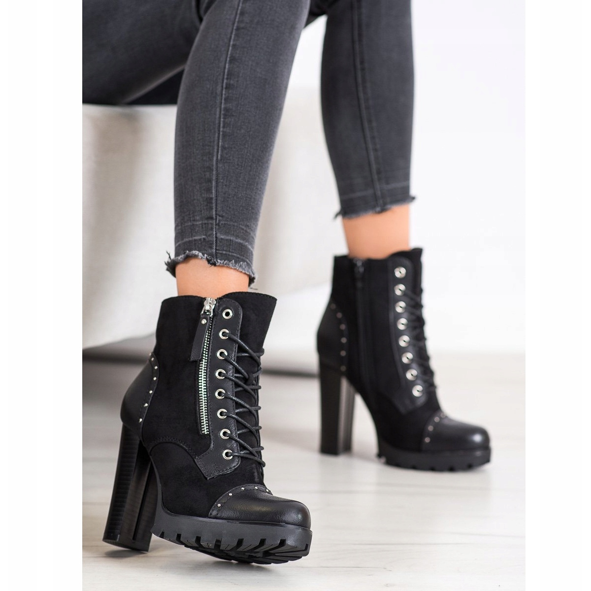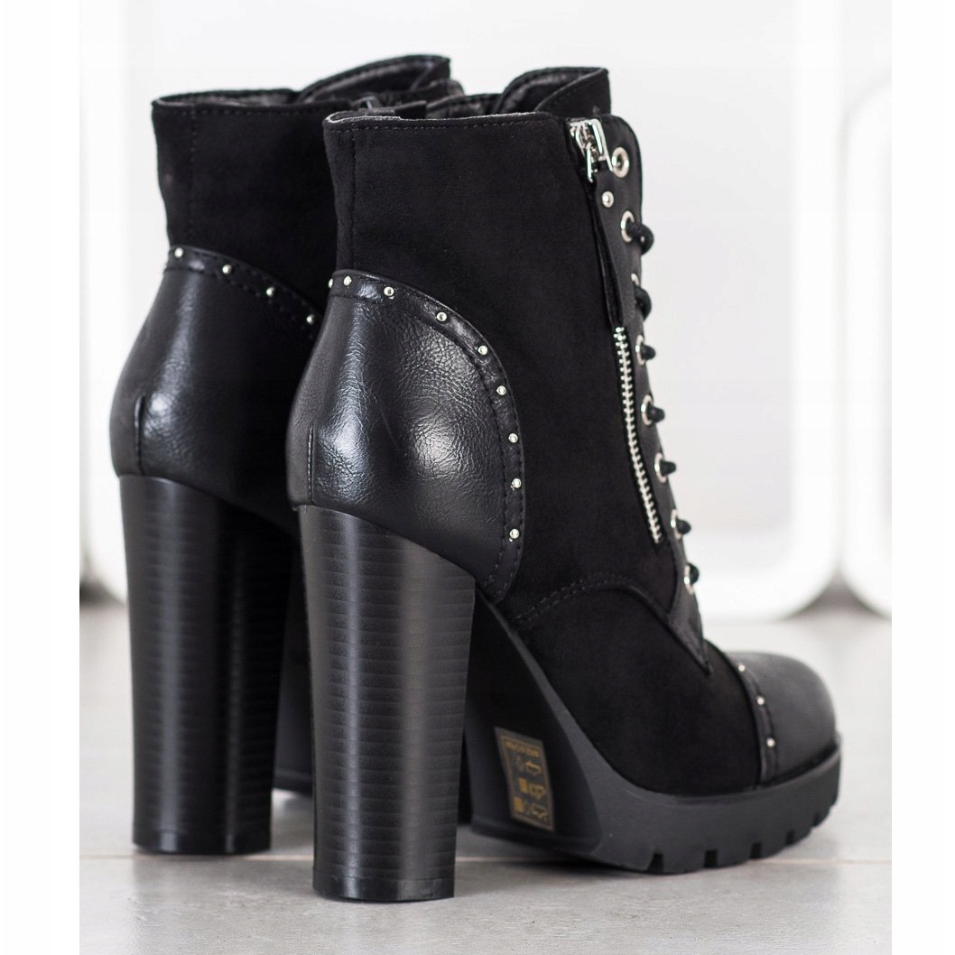 Les bottines sont dotées d'une fermeture à lacets et d'une fermeture éclair pratique, ce qui les rend faciles à enfiler et à enlever. Le talon bloc de 11 cm de haut ajoute de l'élégance et en même temps affine les jambes. La semelle en plastique avec bande de roulement garantit une bonne adhérence, ce qui est important surtout en automne et en hiver.