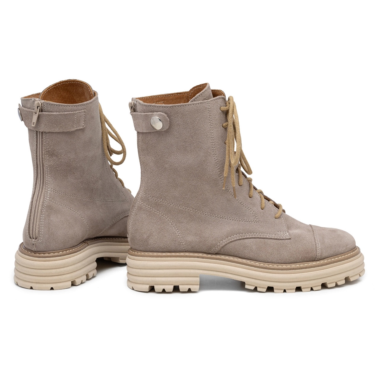 Ces bottes à lacets se distinguent par un cuir suédé naturel de haute qualité, qui non seulement est beau, mais assure également durabilité et confort de port. La fermeture éclair arrière et les lacets permettent un chaussage rapide et une adaptation à la forme du pied, ce qui les rend extrêmement fonctionnels.