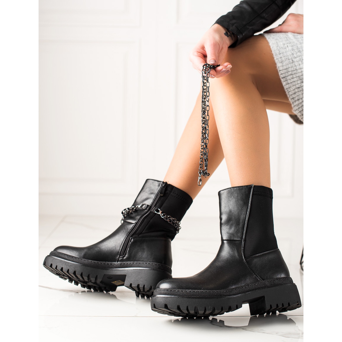 Les chaussures sont fabriquées à partir de matériaux de haute qualité, notamment du simili cuir et du tissu, ce qui les rend à la fois élégantes et pratiques. Un avantage supplémentaire sont les strass décoratifs et une chaîne qui peut être facilement détachée, ce qui vous permet de personnaliser le style. Un nez rond, une isolation et un insert de couverture pour chaussures rendent les sacs confortables et parfaits pour les journées les plus froides.