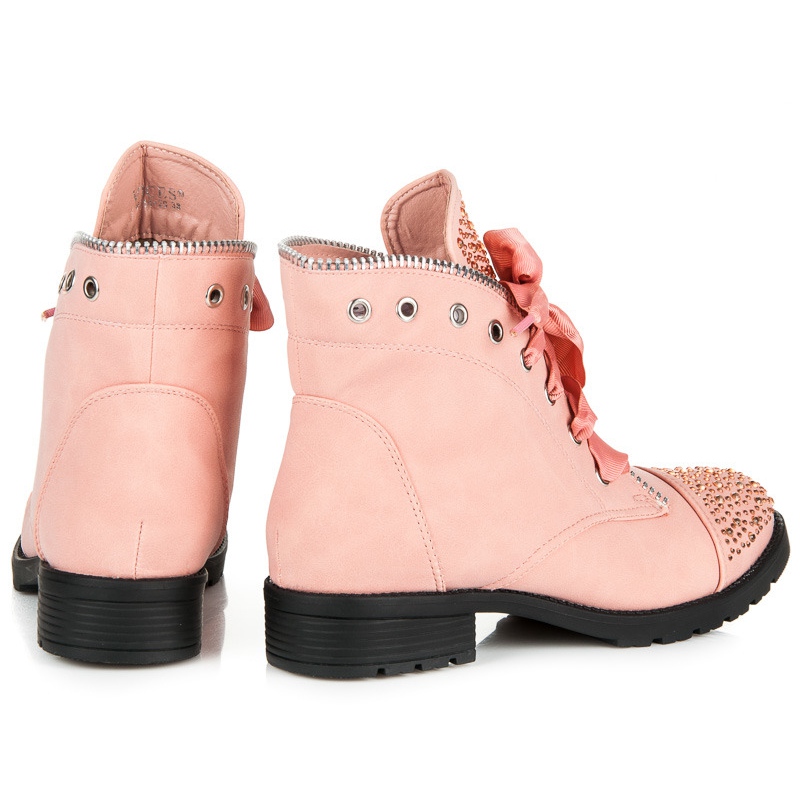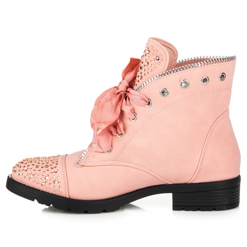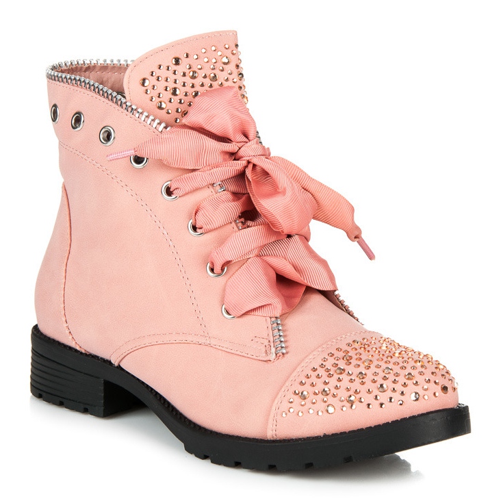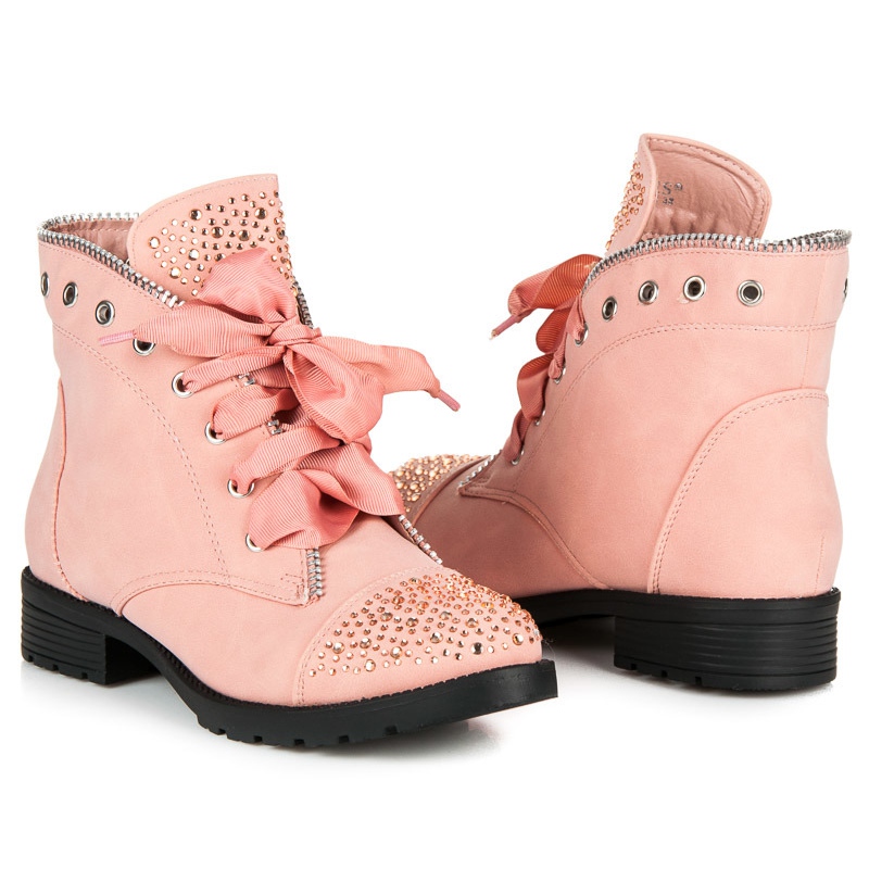 Découvrez la dernière collection de Vices New Collection - des ouvriers élégants avec un ruban de couleur rose tendance ! Parfait pour les femmes qui souhaitent allier confort et style unique. Ces bottines se distinguent non seulement par un talon plat de 3 cm de haut, mais également par des strass qui leur confèrent un caractère unique.