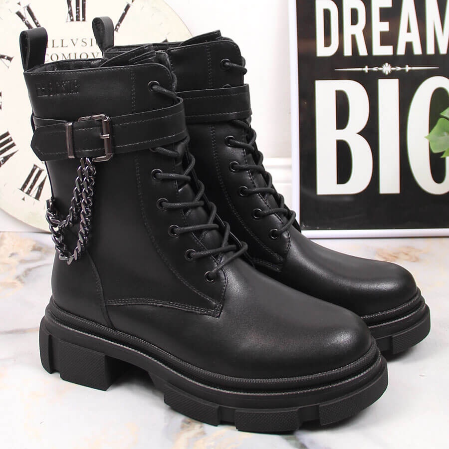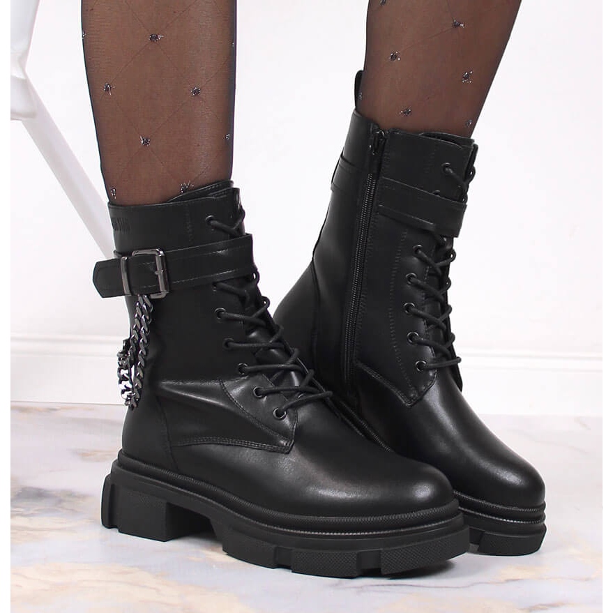 Le design des chaussures fait référence aux dernières tendances et la chaîne caractéristique leur ajoute un style et une expressivité uniques. La fermeture à boucle et à lacets permet un ajustement parfait à la jambe, ce qui augmente le confort d'utilisation.