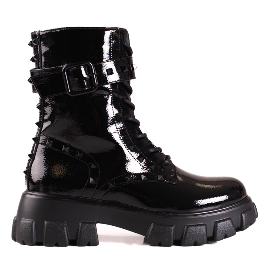 Fabriqués en cuir écologique verni, les ouvriers se distinguent par leur aspect élégant et l'utilisation de clous leur donne un accent distinct et audacieux. Un contrefort de talon intégré et rigidifié ainsi qu'une isolation intérieure sous forme de fourrure assurent confort d'utilisation et protection contre le froid.