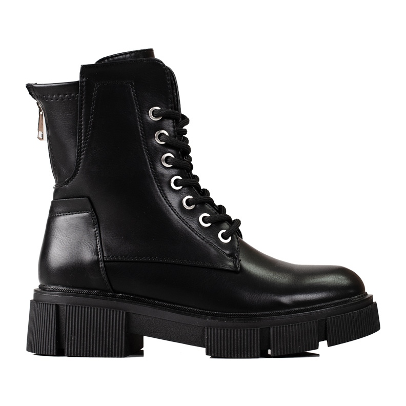 Grâce à la hauteur supérieure au-dessus de la cheville (16 cm) et à la largeur de 22 cm, ces chaussures s'adaptent parfaitement à la jambe, soulignant sa forme. Les ouvriers Shelovet noirs seront un complément parfait à de nombreux styles, parfaits pour des tenues décontractées ou plus rock. Optez pour ces bottines intemporelles qui allient design tendance et praticité !