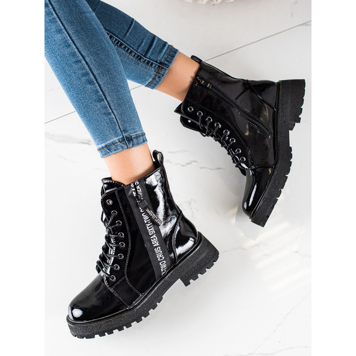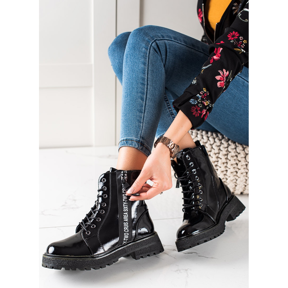 La couleur noire et le cuir écologique verni confèrent aux chaussures un look élégant, et la fermeture éclair décorative attire le regard, leur donnant un caractère unique. La fermeture éclair et le laçage assurent un enfilage facile et un ajustement parfait au pied.
