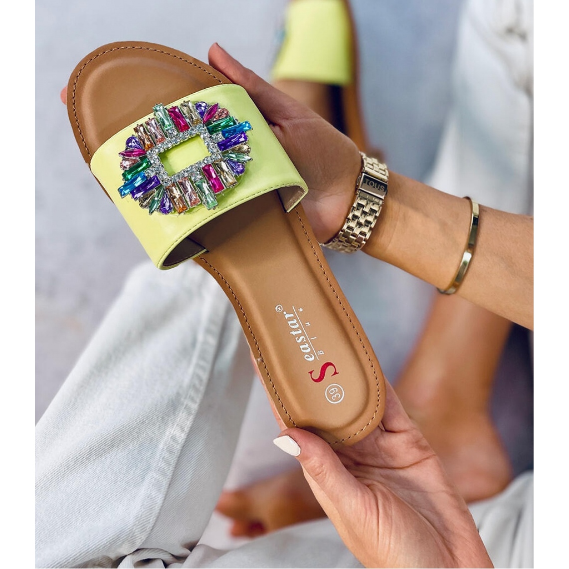 Tongs pour femmes à semelle plate. Une large ceinture ornée de pierres colorées et brillantes rend impossible de quitter les yeux :) Donnez-leur une chance de conquérir votre garde-robe ! Matériau extérieur ? cuir écologique.