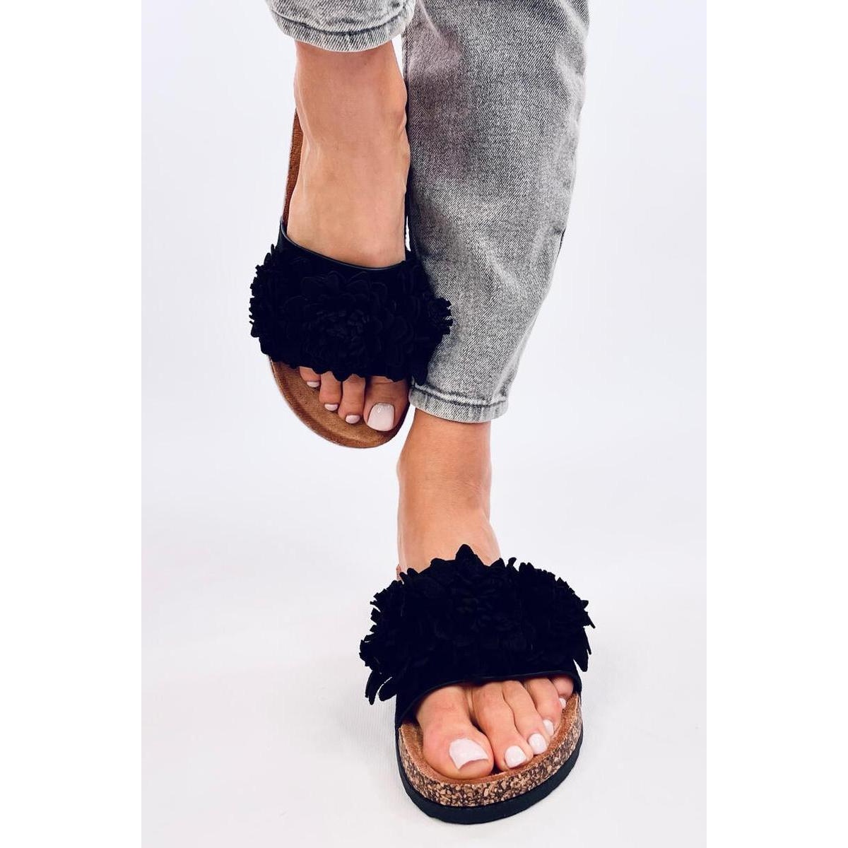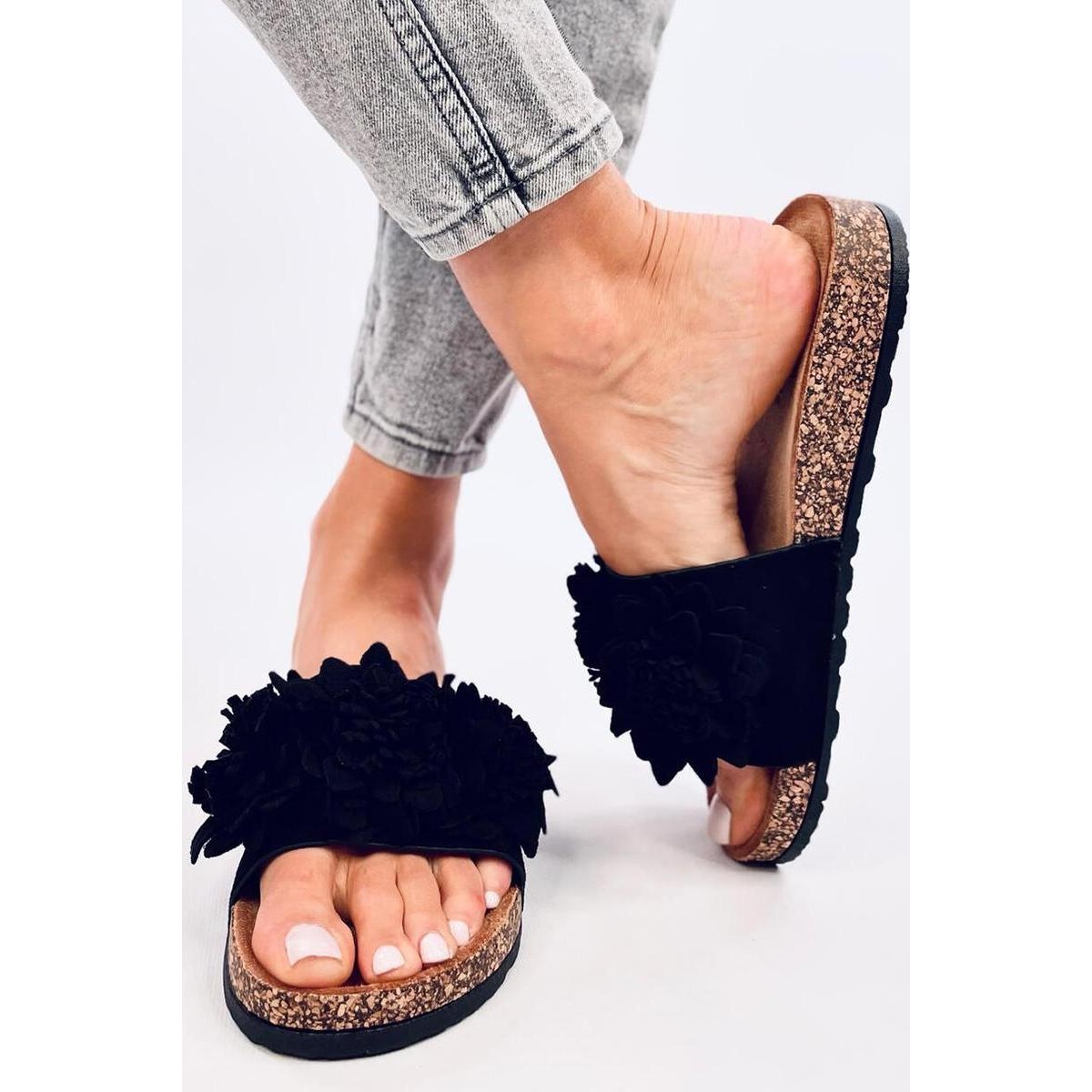 Cherchez-vous les volets d'été parfaits? Sandals Cork Flip Flops avec des fleurs noires de Sebill d'Inollo est une proposition qui attirera certainement votre attention! Ces pantoufles de femmes en daim dans une couleur noire classique sont un complément à la mode à chaque stylisation d'été.