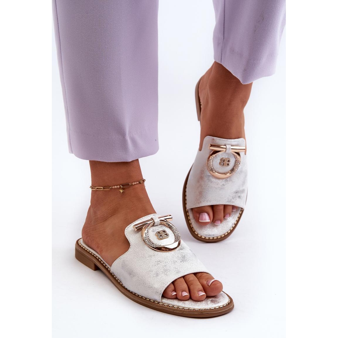 Les tongs élégantes pour femmes de S.Barski sont non seulement élégantes, mais aussi extrêmement confortables. Monté sur un talon plat. Brillant avec décoration dorée. Un insert souple en cuir naturel assure le confort lors de l'utilisation. Un choix parfait pour de nombreuses occasions différentes, il ajoutera un charme raffiné à votre style.
