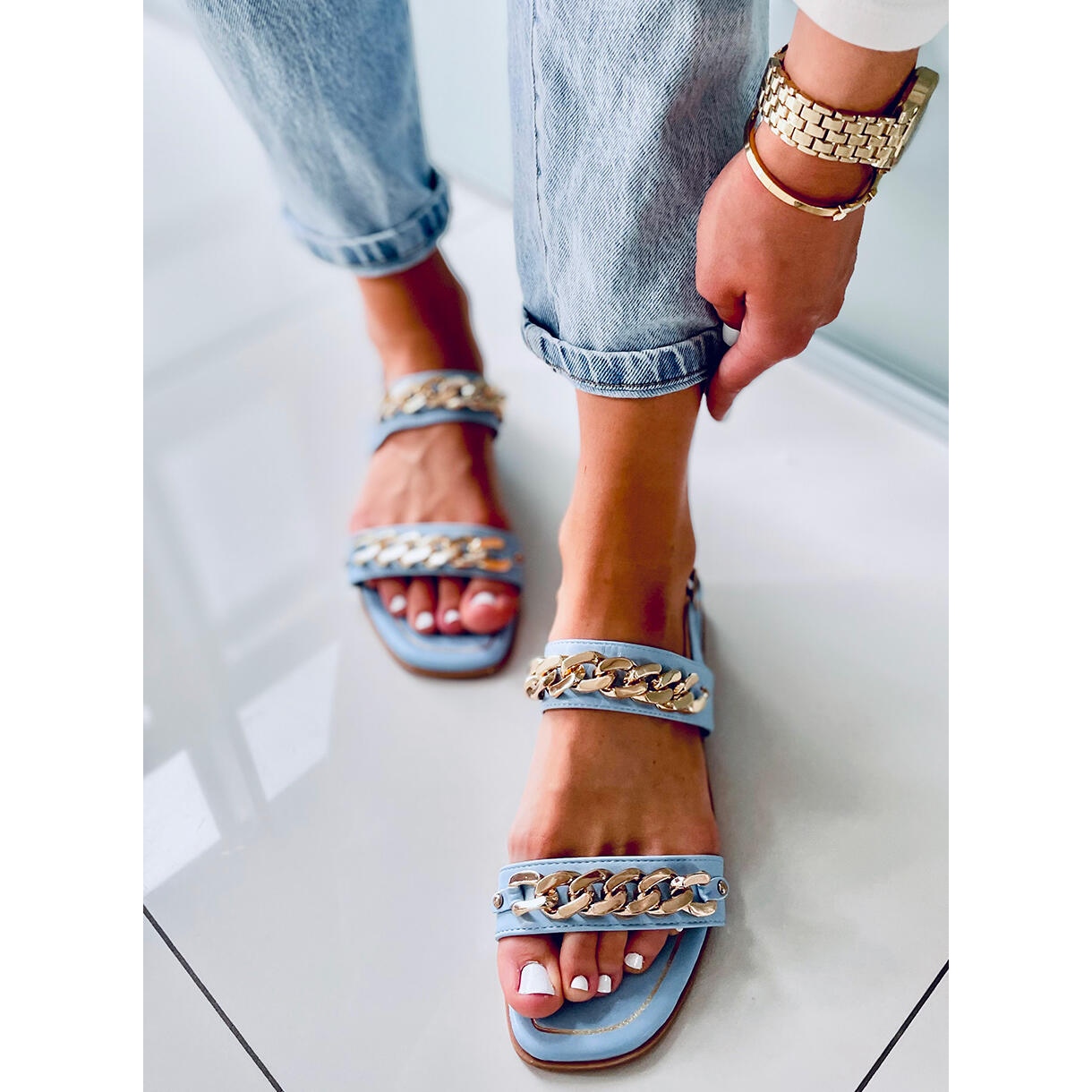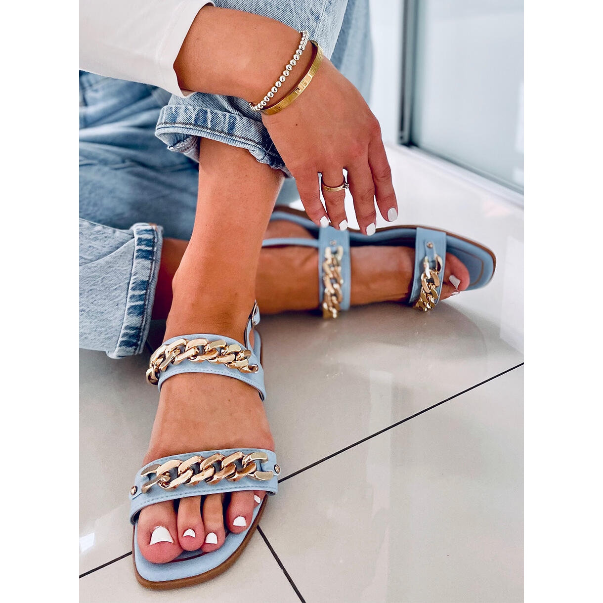 Découvrez des sandales à chaîne India Blue tendance et confortables dans une superbe couleur bleue ! Ces sandales pour femmes élégantes à semelle plate sont un choix parfait pour un usage quotidien, parfaitement en phase avec les dernières tendances. Les chaînes en or leur donnent du caractère et les distinguent des autres modèles du marché.