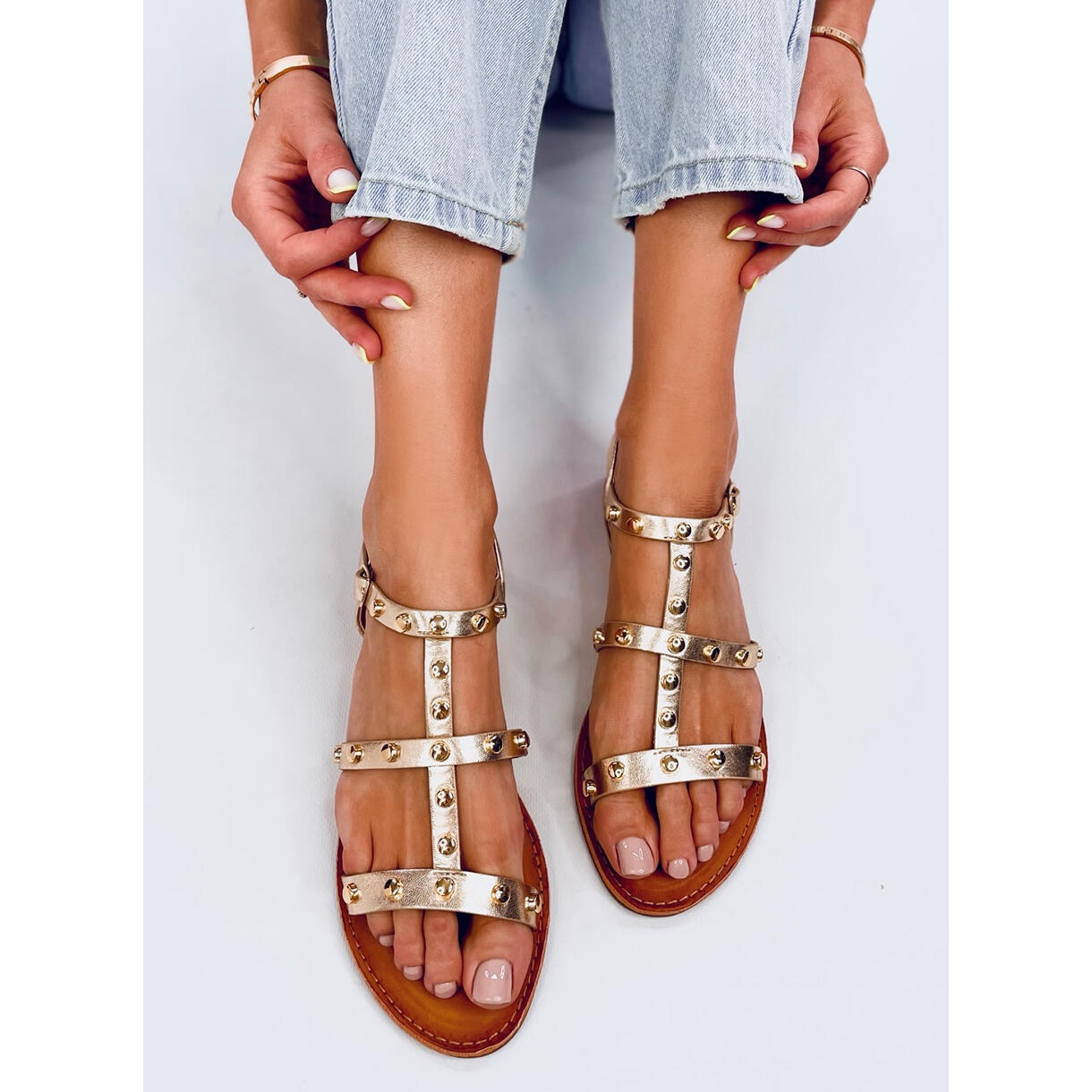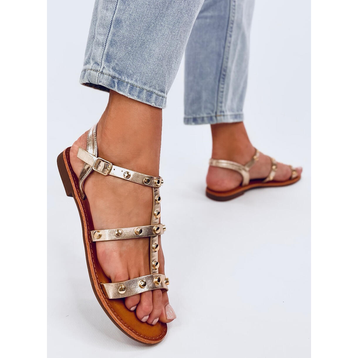 Découvrez les sandales cloutées Neha Gold uniques, qui sont le choix parfait pour les journées d'été. Ces sandales plates pour femme se caractérisent par une belle finition métallique dans une nuance dorée, grâce à laquelle elles soulignent parfaitement un bronzage estival. Les clous accrocheurs leur confèrent un caractère unique, ce qui en fait un complément parfait à tout style décontracté.
