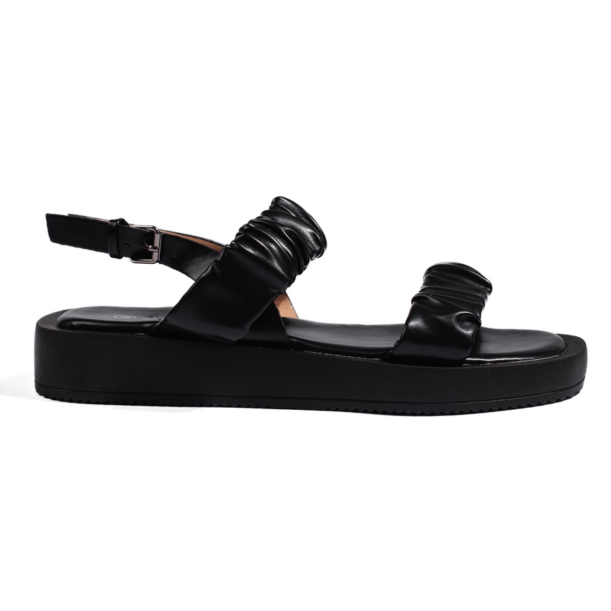 La semelle intérieure et le matériau interne en cuir écologique s'occupent du confort du pied, et la semelle en plastique solide assure la stabilité à chaque étape. Les sandales noires sont un vêtement intemporel qui se passe bien avec des robes élégantes et des tenues décontractées.
