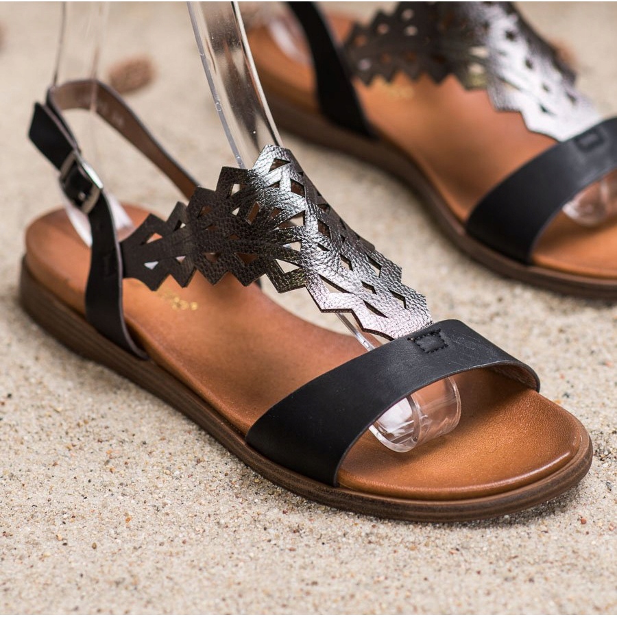 Ce sont des sandales à la mode Sergio Leone en noir - un choix parfait pour les chaudes journées d'été ! Ces chaussures décontractées pour femmes sont fabriquées dans une matière imitant le cuir, ce qui assure confort de port et facilité d'entretien. Les sandales se distinguent par une tige élégante d'un coloris noir classique et une cale argentée originale avec un motif ajouré qui leur donne du caractère.
