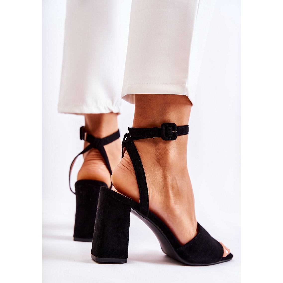 Les sandales ont été conçues dans un souci de fonctionnalité maximale. Ils sont dotés d'une bride réglable fixée autour de la cheville, qui assure un ajustement parfait à la jambe. Le bout est ouvert et carré, ce qui ajoute un caractère moderne. La hauteur des poteaux est de 8 cm, ce qui leur permet de modeler parfaitement la silhouette, tout en étant stables et confortables.