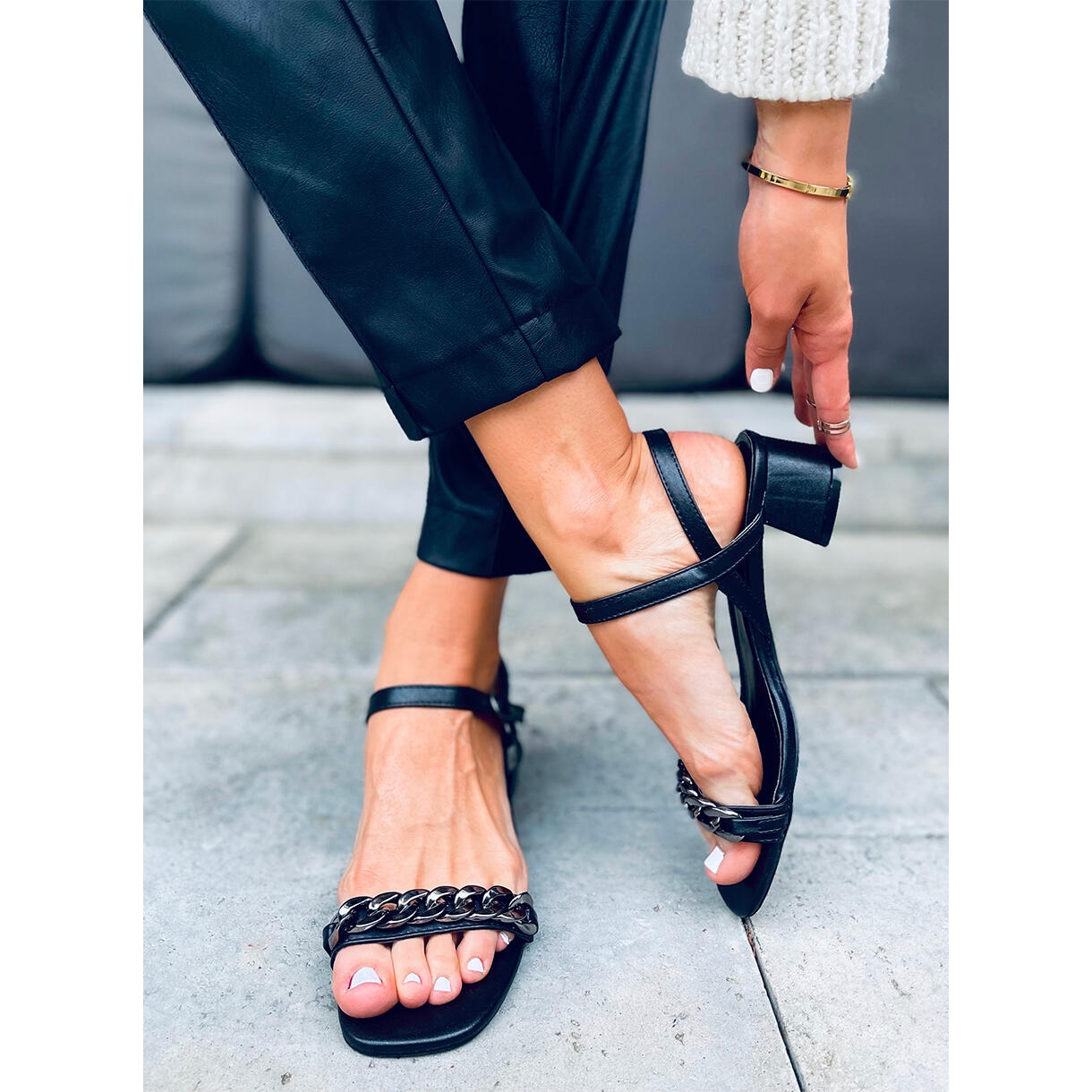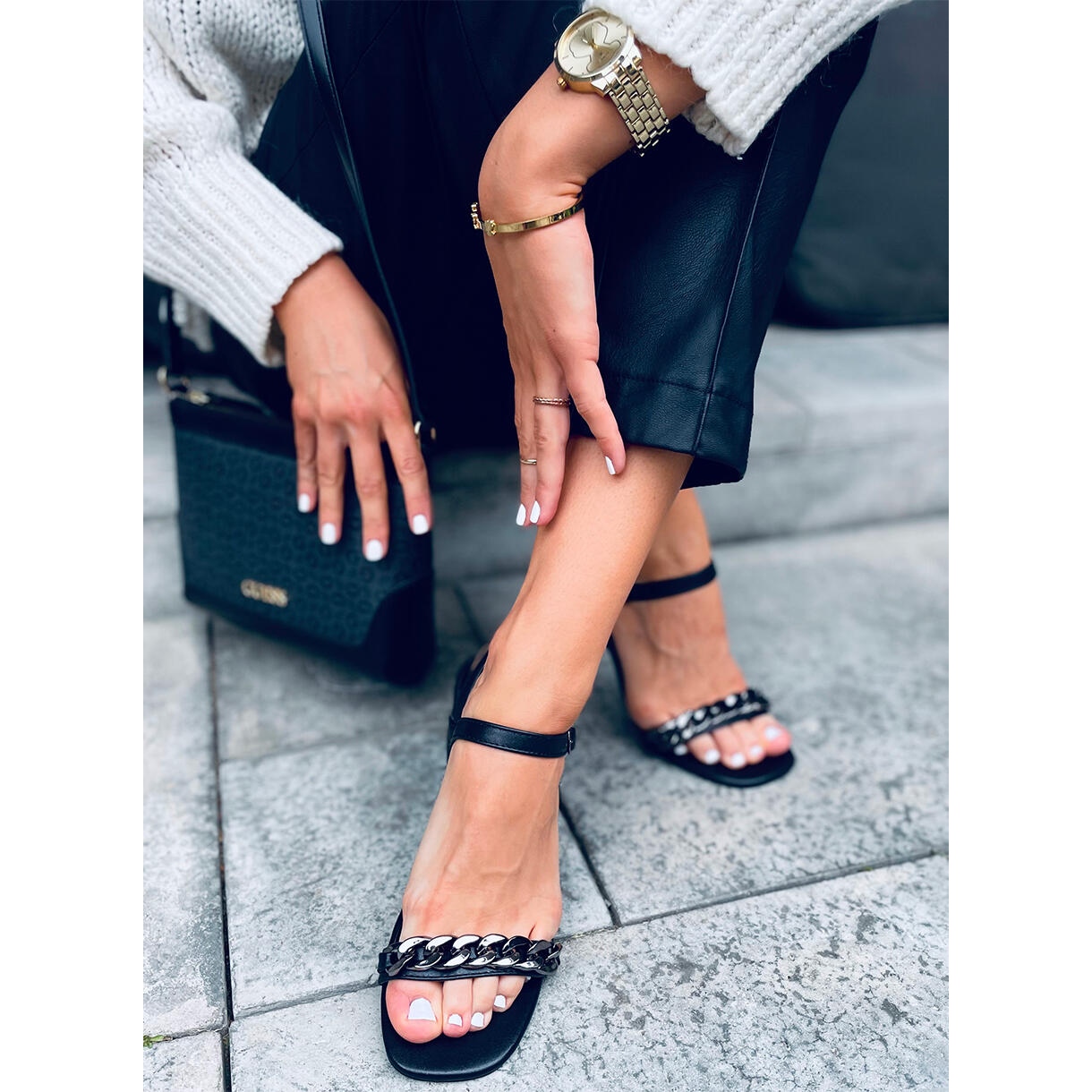 Découvrez les sandales à talons bas Daphné Black, qui complèteront parfaitement votre garde-robe de tous les jours ! Ces élégantes sandales noires en cuir écologique de haute qualité combinent un design classique avec les détails les plus tendance, comme des chaînes élégantes.