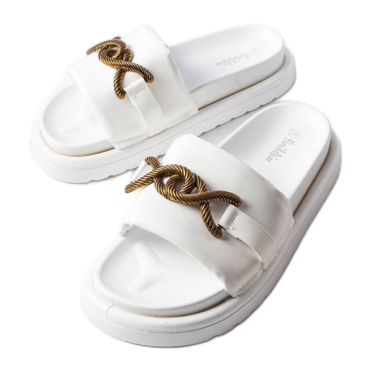 Les tongs blancs sur la plate-forme Frédérique - des pantoufles pour femmes élégantes et confortables avec une délicate chaîne en or. Parfait pour l'été - pour les stylisations de tous les jours, les promenades dans la ville ou lors de voyages de vacances.