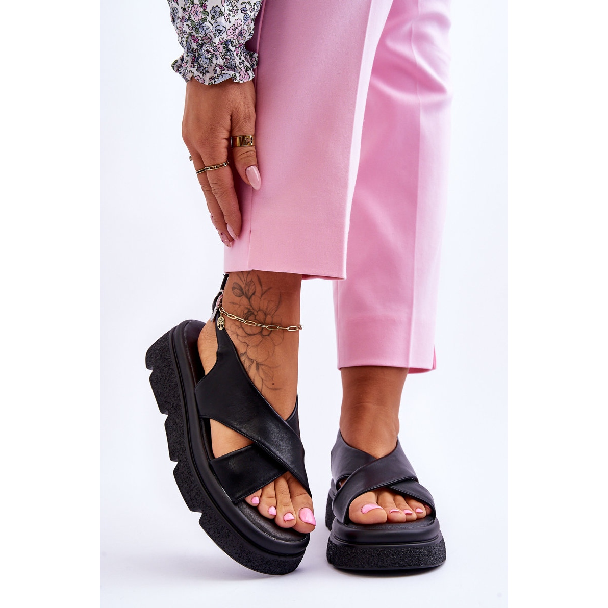 Les sandales sont montées sur une plateforme massive de 4 cm de hauteur et un talon de 5 cm, ce qui ajoute de la légèreté à la silhouette et assure en même temps la stabilité. La semelle intérieure en éco-cuir souple signifie que même un port à long terme ne provoque pas d'inconfort. Un avantage supplémentaire est le manque d’isolation, ce qui en fait un excellent choix pour les journées chaudes.