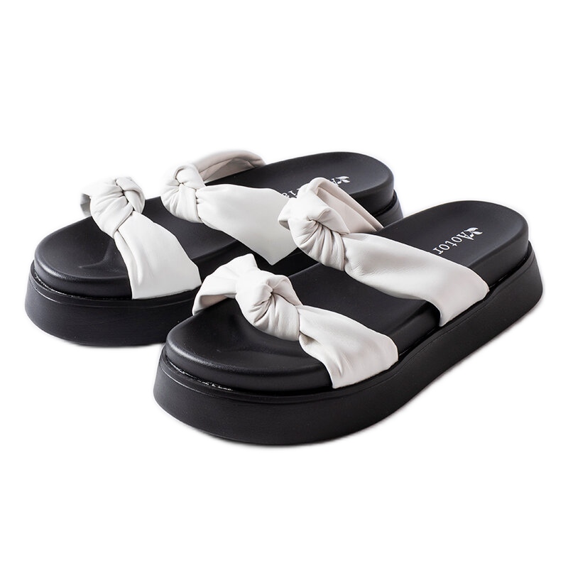Les tongs blancs sur la plate-forme Katelin - une offre d'été légère au quotidien. La coupe minimaliste dans une couleur blanche universelle avec une semelle noire fonctionnera à la fois pour les shorts courts et les robes aérées. La plate-forme de 4,5 cm de haut ajoute des centimètres et de la stabilité, en maintenant le confort lors de l'usure complète.