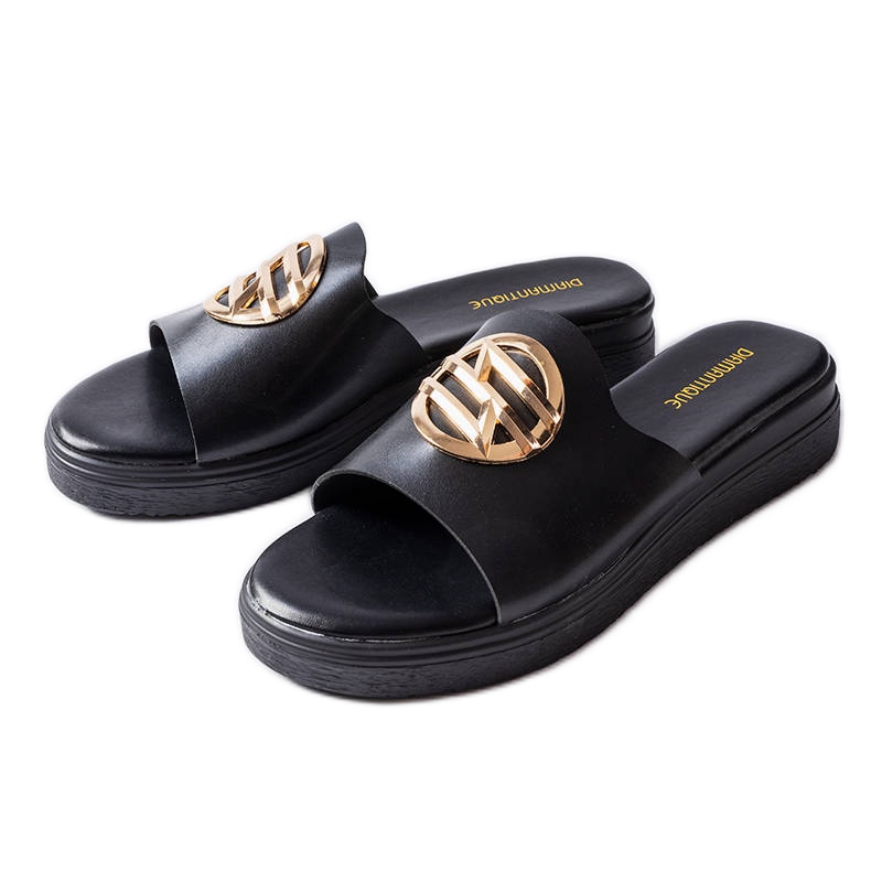 Les tongs noirs sur la plate-forme Michelle sont une combinaison de confort et une lueur subtile - parfaite pour les jours d'été. La structure glissée, le cuir écologique et la décoration avec des strass créent un modèle universel et à la mode pour les stylisations de tous les jours.