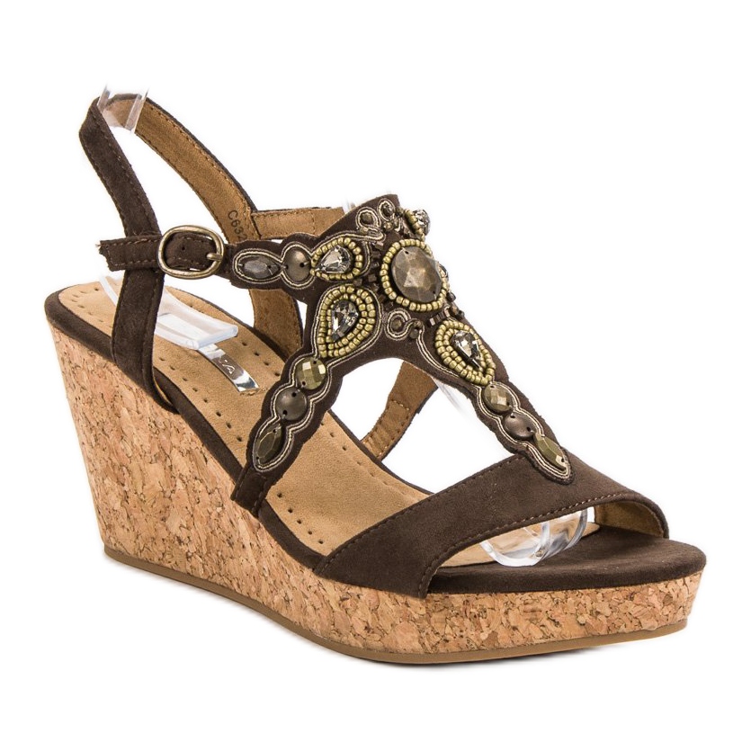 Vous recherchez des chaussures confortables et élégantes pour les journées d'été ? Les sandales compensées en liège marron de la marque Corina sont un choix parfait qui égayera tout style bohème, décontracté et élégant ! Grâce à la combinaison unique de cristaux et de perles, ces sandales deviennent un accessoire tendance qui attire le regard.