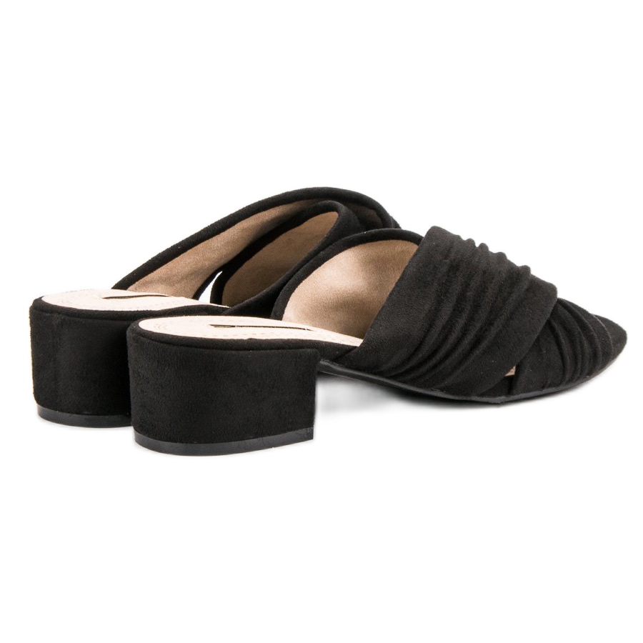 Les mules à talons hauts Corina noires sont un choix parfait pour les femmes qui souhaitent allier confort et élégance dans leur style de tous les jours. Fabriquées à partir de cuir suédé écologique de la plus haute qualité, les tongs séduisent par l'attention portée aux détails, et de beaux volants sur les bretelles leur confèrent un charme unique.